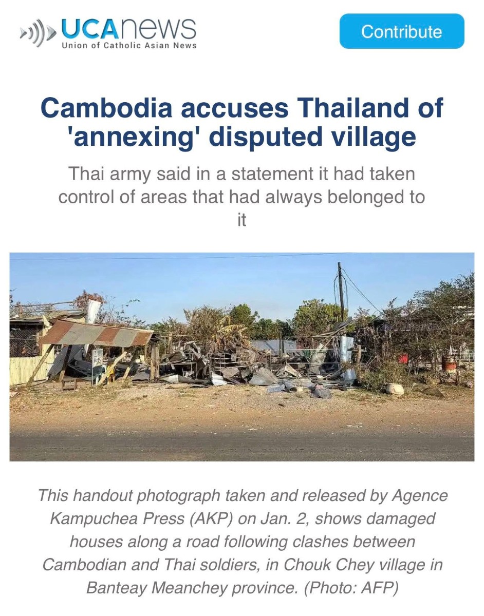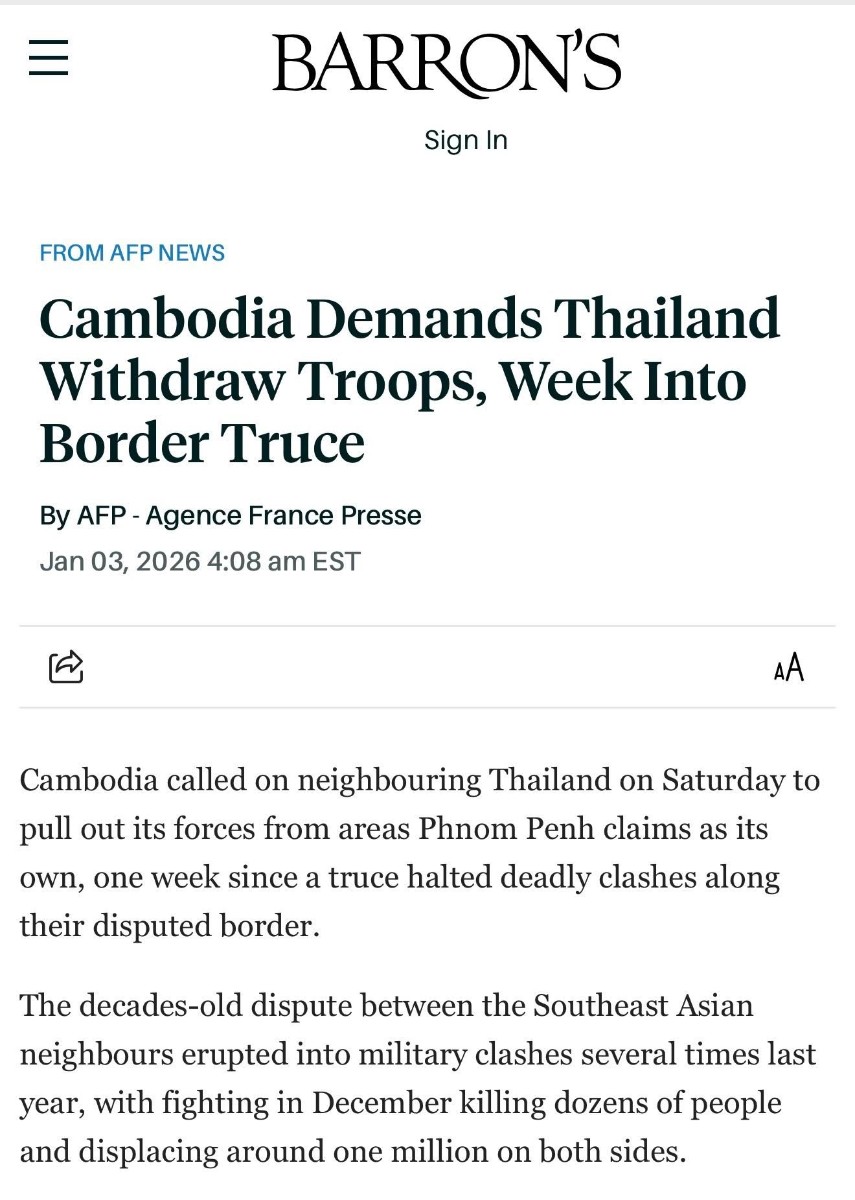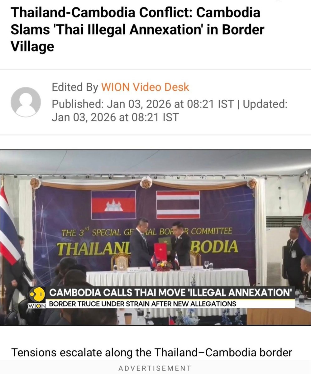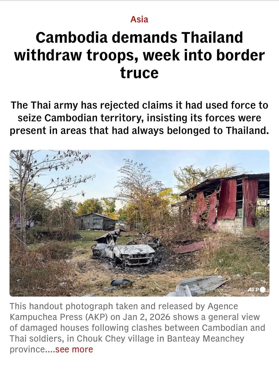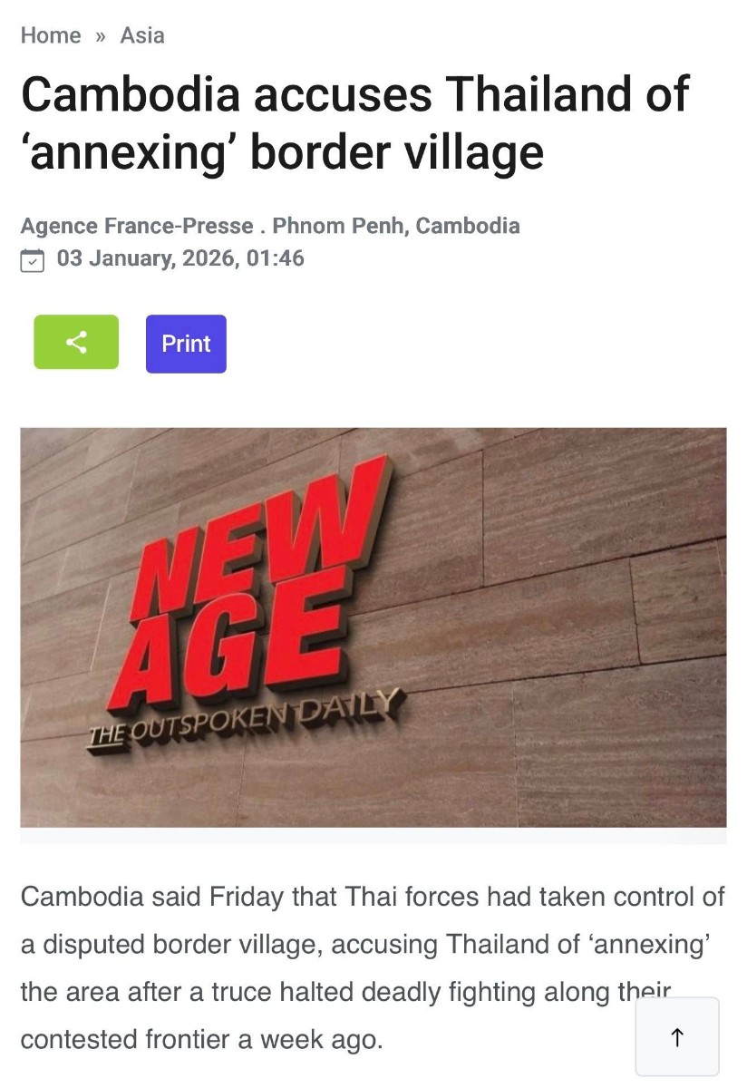 តាមរយៈបណ្ដាញសង្គមហ្វេសប៊ុកថ្ងៃទី០៤ ខែមករា ឆ្នាំ២០២៦ ឯកឧត្ដមរដ្ឋមន្ត្រីក្រសួងព័ត៌មានបានថ្លែងថា នៅថ្ងៃទី២ និងទី៣ ខែមករា ឆ្នាំ២០២៦ សារព័ត៌មាននានានៅលើពិភពលោកបានផ្សព្វផ្សាយព័ត៌មានអំពីយោធាថៃបានរំលោភបំពានមកលើទឹកដីកម្ពុជាក្រោយបទឈប់បាញ់ចូលជាធរមាន ដោយបានដាក់កុងតឺន័រ រាយបន្លាលួស និងដាក់ទងជាតិលើទឹកដីកម្ពុជា និងប្រកាសថាជាទឹកដីខ្លួនទៅវិញ។ ឯកឧត្ដមបន្តថា សារព័ត៌មាននានាបានដកស្រង់ខ្លឹមសារនៃសេចក្តីថ្លែងការណ៍របស់ក្រសួងការបរទេស និងសហប្រតិបត្តិការអន្តរជាតិកម្ពុជាដែលបញ្ជាក់ពីការឈ្លានពានរបស់យោធាថៃមកលើទឹកដីកម្ពុជា។ ការកាន់កាប់ទឹកដីកម្ពុជាដោយកងទ័ពថៃ ក្រោយបទឈប់បាញ់ និងវាយកម្ទេចផ្ទះសម្បែងប្រជាជន និងហេដ្ឋារចនាសម្ព័ន្ធ ជាការរំលោភយ៉ាងជាក់ច្បាស់ចំពោះគោលការណ៍ជាមូលដ្ឋាននៃច្បាប់អន្តរជាតិ ក៏ដូចជាច្បាប់មនុស្សធម៌ និងច្បាប់សិទ្ធិមនុស្សអន្តរជាតិ។ សារព័ត៌មានបានលើកឡើងពីផែនការថៃដែលភ្ជាប់តំបន់មួយចំនួនរបស់កម្ពុជាទៅនឹងទឹកដីរបស់ខ្លួនដោយខុសច្បាប់។