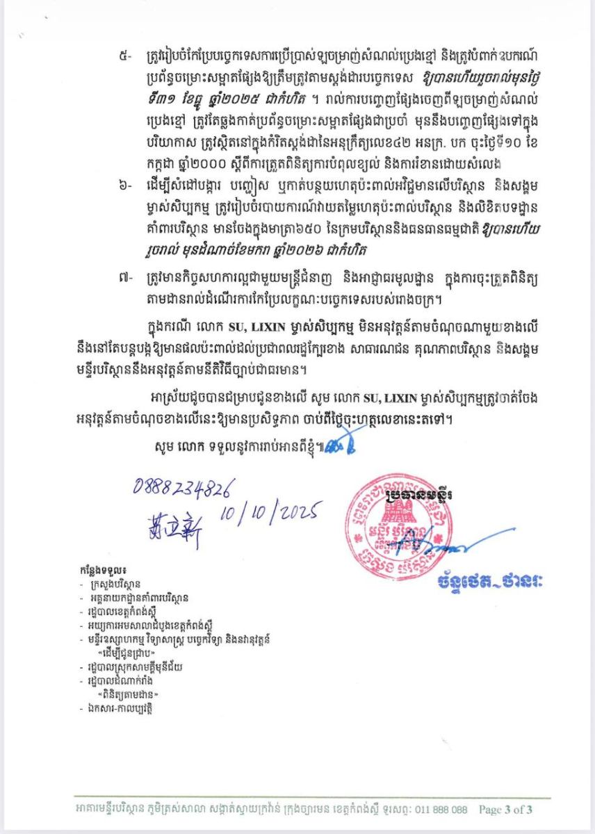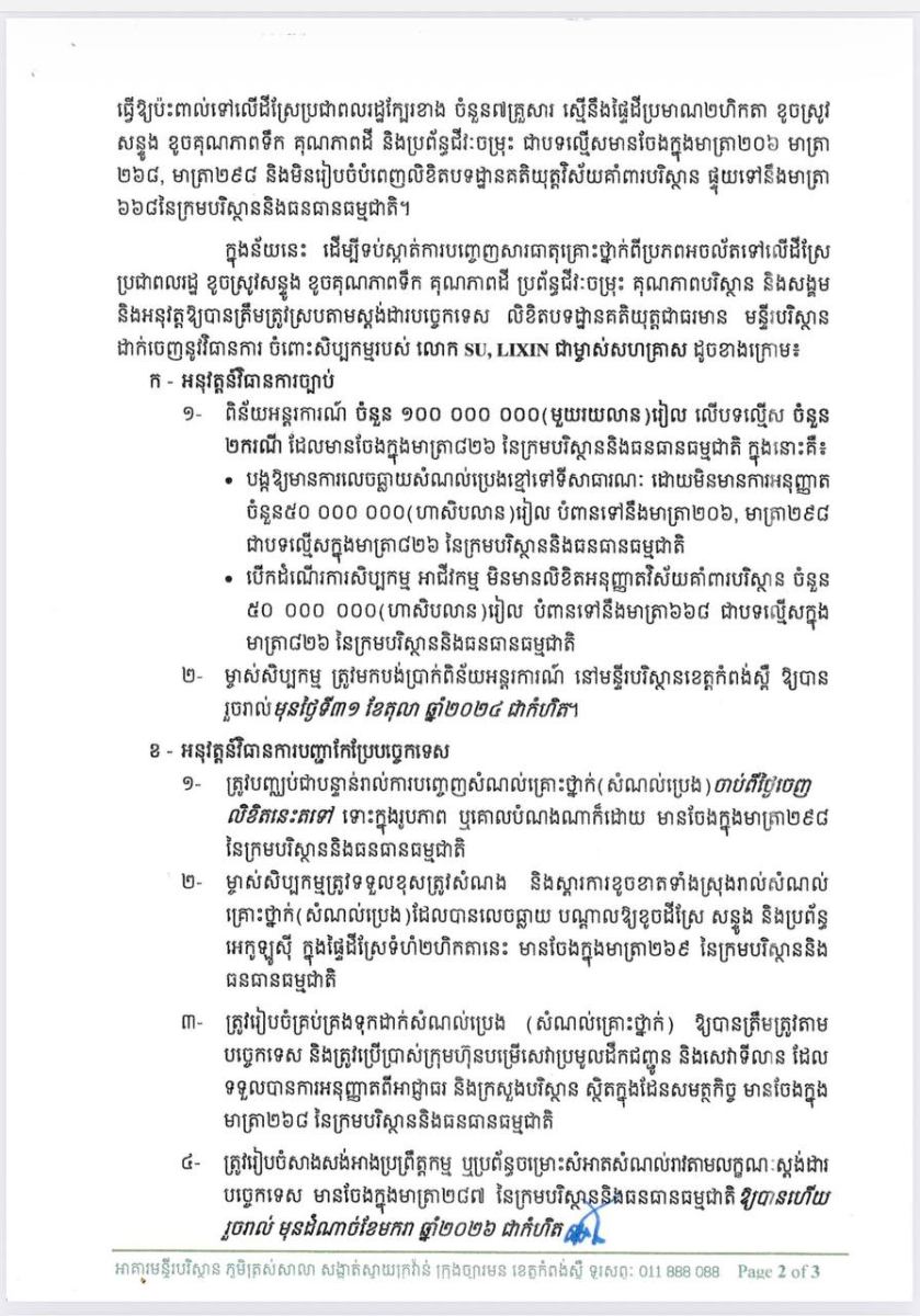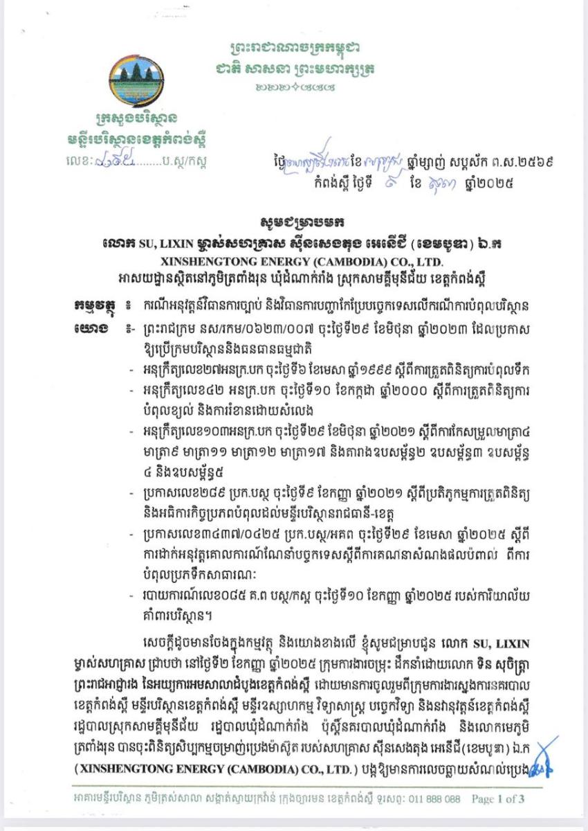 ជាឧទាហរណ៍ ករណីរោងចក្រ XINSHENGTONG ENERGY (CAMBODIA) CO.,LTD ដែលមានមូលដ្ឋាននៅភូមិត្រពាំងរុន ឃុំដំណាក់វាំង ស្រុកសាមគ្គីមុនីជ័យ ខេត្តកំពង់ស្ពឺ កាលពីថ្ងៃទី២ ខែកញ្ញា ឆ្នាំ២០២៥ កន្លងទៅនេះ ត្រូវបានរកឃើញថា មិនបានគោរពច្បាប់បរិស្ថាននិងបទដ្ឋានគតិយុត្តចូលជាធរមាននៅកម្ពុជា។ ក្រុមការងារចម្រុះ បានរកឃើញរោងចក្រខាងលើនេះ បានបង្កឱ្យមានការលេចធ្លាយសំណល់ប្រេង ធ្វើឱ្យប៉ះពាល់ដីស្រែប្រជាពលរដ្ឋ នៅក្បែរនោះចំនួនប្រមាណ២ហិចតា ខូចស្រូវ ខូចសន្ទូង ខូចគុណភាពទឹក គុណភាពដី និងប្រព័ន្ធជីវៈចម្រុះ ជាបទល្មើសមានចែងក្នុងមាត្រា២០៦ មាត្រា២៦៨ មាត្រា២៩៨ និងមាត្រា៦៦៨នៃក្រមបរិស្ថាននិងធនធានធម្មជាតិ។