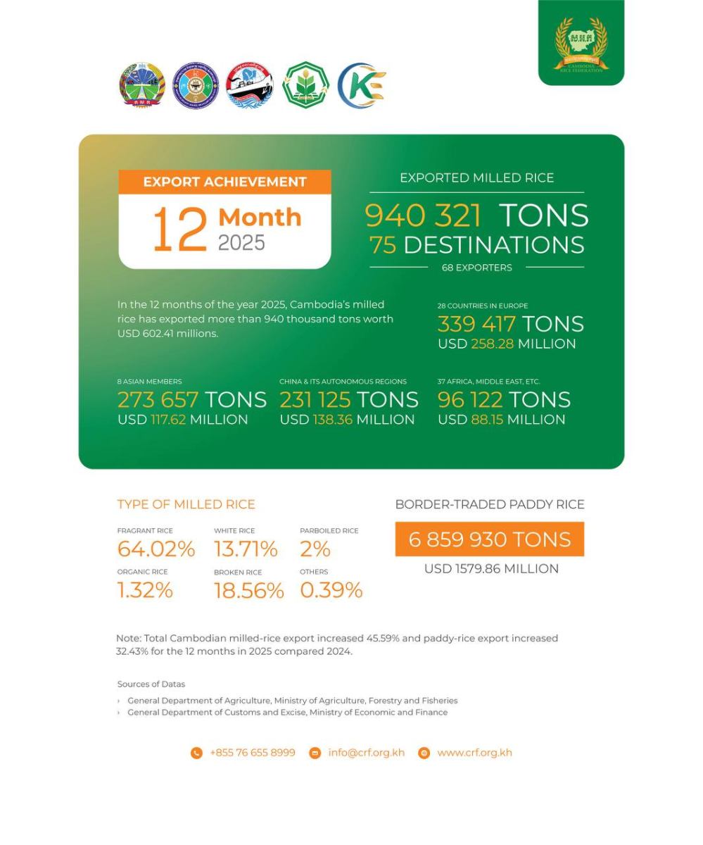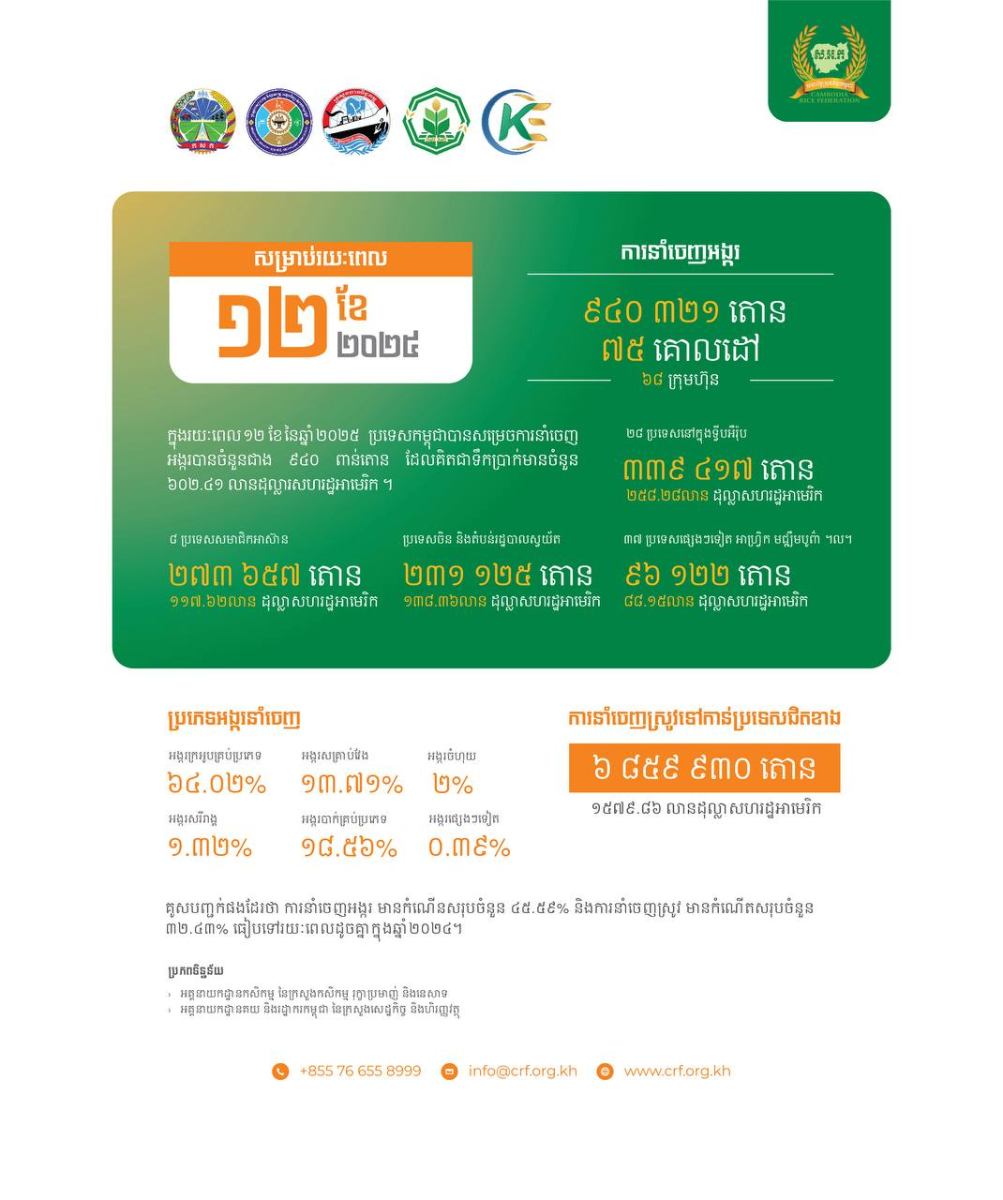 ការនាំចេញក្នុងរយៈពេល១២ខែ នៃឆ្នាំ ២០២៥ កម្ពុជាបាននាំចេញអង្ករចំនួន៩៤០,៣២១ តោន គិតជាទឹកប្រាក់ បានចំនួន ៦០២.៤១ លានដុល្លារសហរដ្ឋអាមេរិក