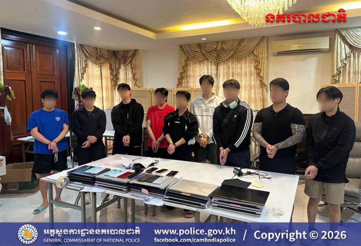 ភ្នំពេញ ៖ នៅថ្ងៃទី៥ ខែមករា ឆ្នាំ២០២៦ កម្លាំងសមត្ថកិច្ចនៃអគ្គស្នងការដ្ឋាននគរបាលជាតិ បានឃាត់ខ្លួនជនជាតិកូរ៉េខាងត្បូងចំនួន ៣២នាក់ ដែលបានប្រព្រឹត្តបទល្មើសឆបោកអនឡាញ ក្នុងទីតាំង ៤ផ្សេងគ្នា ស្ថិតនៅភូមិសាស្រ្តបុរីប៉េងហួតបឹងស្នោរ ខណ្ឌច្បារអំពៅ រាជធានីភ្នំពេញ ។