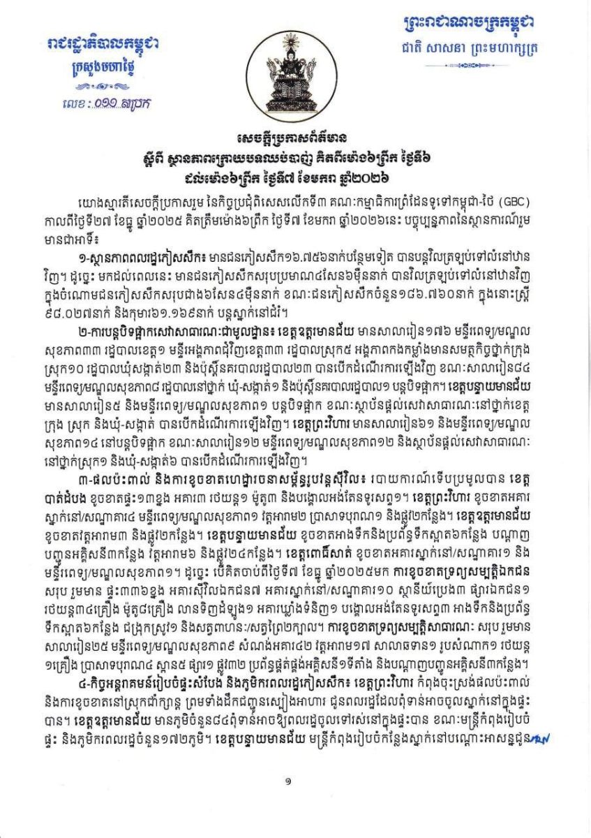 យោងស្មារតីសេចក្តីប្រកាសរួម នៃកិច្ចប្រជុំពិសេសលើកទី៣ គណៈកម្មាធិការព្រំដែនទូទៅកម្ពុជា-ថៃ (GBC) កាលពីថ្ងៃទី២៧ ខែធ្នូ ឆ្នាំ២០២៥ គិតត្រឹមម៉ោង៦ព្រឹក ថ្ងៃទី៧ ខែមករា ឆ្នាំ២០២៦នេះ មានជនភៀសសឹក១៦.៧៥៦នាក់បន្ថែមទៀត បានបន្តវិលត្រឡប់ទៅលំនៅឋានវិញ។ ដូច្នេះ មកដល់ពេលនេះ មានជនភៀសសឹកសរុបប្រមាណ៤សែន៦ម៉ឺននាក់ បានវិលត្រឡប់ទៅលំនៅឋានវិញ ក្នុងចំណោមជនភៀសសឹកសរុបជាង៦សែន៤ម៉ឺននាក់ ខណៈជនភៀសសឹកចំនួន១៨៦.៧៦០នាក់ ក្នុងនោះស្ត្រី ៩៨.០២៧នាក់ និងកុមារ៦១.១៦៩នាក់ បន្តស្នាក់នៅជំរំ។ នេះបើតាមសេចក្តីប្រកាសព័ត៌មានរបស់ក្រសួងមហាផ្ទៃ។
