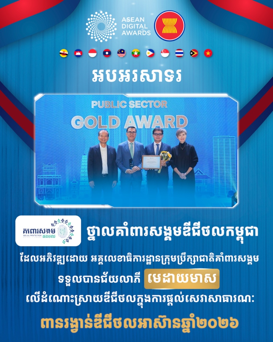 ក្រសួងប្រៃសណីយ៍និងទូរគមនាគមន៍ (ក.ប.ទ.) មានកិត្តិយសសូមជម្រាបជូនសាធារណជនទាំងអស់ មេត្តាជ្រាបថា កាលពីថ្ងៃទី១៥ ខែមករា ឆ្នាំ២០២៦ “ថ្នាលគាំពារសង្គមឌីជីថលកម្ពុជា – Cambodia Digital Social Protection Platform” ឈ្នះមេដាយមាស នៅក្នុងពានរង្វាន់ឌីជីថលអាស៊ានឆ្នាំ២០២៦ ដែលរៀបចំនៅសាធារណរដ្ឋសង្គមនិយមវៀតណាម ក្រោមក្របខណ្ឌកិច្ចប្រជុំរដ្ឋមន្ត្រីឌីជីថលអាស៊ានលើកទី៦ (The 6th ASEAN Digital Ministers’ Meeting – ADGMIN 2026) ដោយមានការចូលរួមពីរដ្ឋមន្រ្តីឌីជីថលអាស៊ាន និងដៃគូអាស៊ាន ដែលរួមមានសាធារណរដ្ឋកូរ៉េ ចិន ជប៉ុន ឥណ្ឌា សហរដ្ឋអាម៉េរិក និងសហភាពទូរគមនាគមន៍អន្តជាតិ។