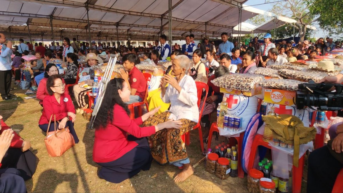 សម្តេចកិត្តិព្រឹទ្ធបណ្ឌិត ប៊ុន រ៉ានី ហ៊ុនសែន ប្រធានកាកបាទក្រហមកម្ពុជា អញ្ជើញជួបសំណេះសំណាលសួរសុខទុក្ខ និងចែកអំណោយមនុស្សធម៌ ជូនដល់ប្រជាជនភៀសសឹកចំនួន ២២០៥ គ្រួសារ មកពីតាមបណ្តាខេត្តចំនួន៥ ដែលមកស្នាក់នៅបណ្តោះអាសន្ន ក្នុងស្រុកក្រឡាញ់ ខេត្តសៀមរាប។