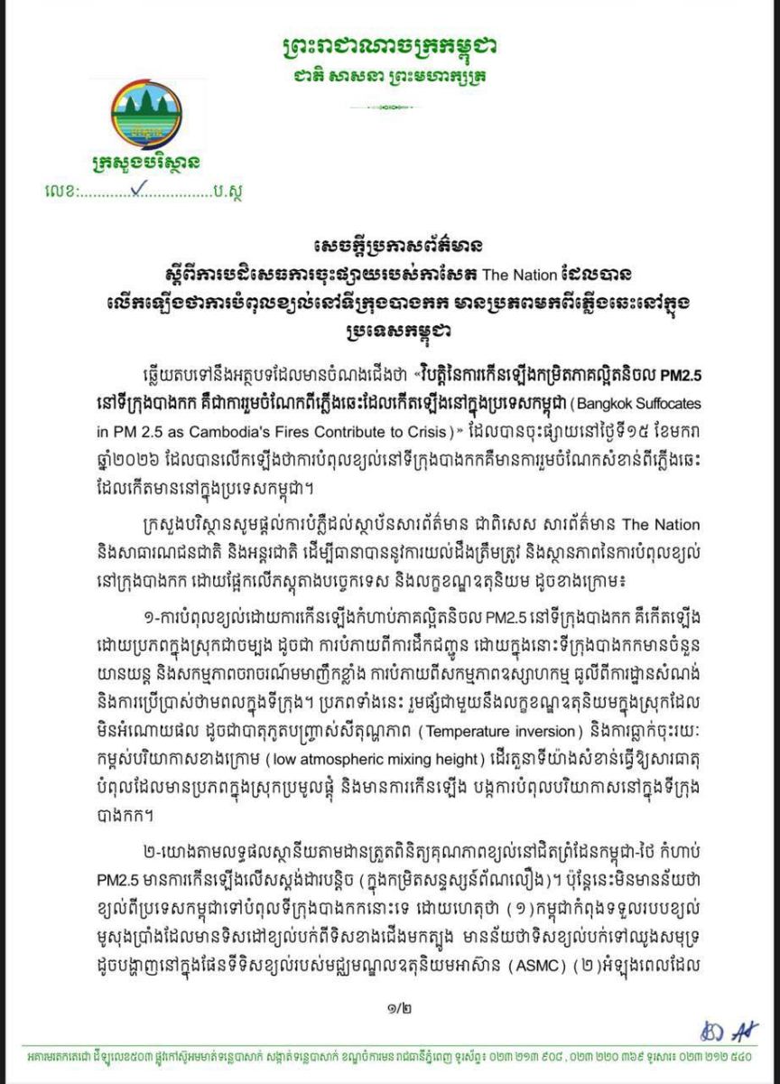 ក្រសួងបរិស្ថានកម្ពុជាបានលើកឡើងថា ឆ្លើយតបទៅនឹងអត្ថបទដែលមានចំណងជើងថា «វិបត្តិនៃការកើនឡើងកម្រិតភាគល្អិតនិចល PM2.5 នៅទីក្រុងបាងកក គឺជាការរួមចំណែកពីភ្លើងឆេះដែលកើតឡើងនៅក្នុងប្រទេសកម្ពុជា (Bangkok Suffocates in PM 2.5 as Cambodia’s Fires Contribute to Crisis) ដែលបានចុះផ្សាយនៅថ្ងៃទី១៥ ខែមករា ឆ្នាំ២០២៦ ដែលបានលើកឡើងថា ការបំពុលខ្យល់នៅទីក្រុងបាងកកគឺមានការរួមចំណែកសំខាន់ពីភ្លើងឆេះ ដែលកើតមាននៅក្នុងប្រទេសកម្ពុជា។
