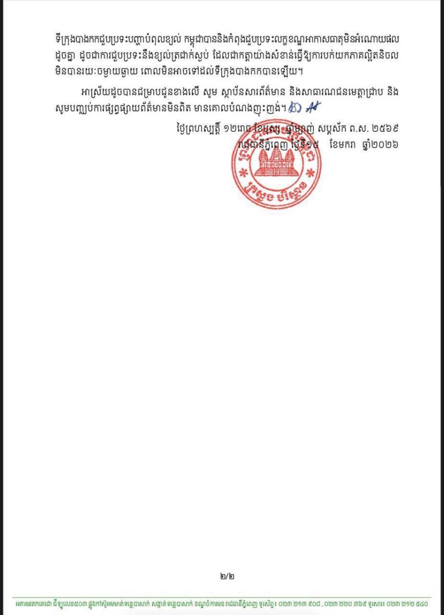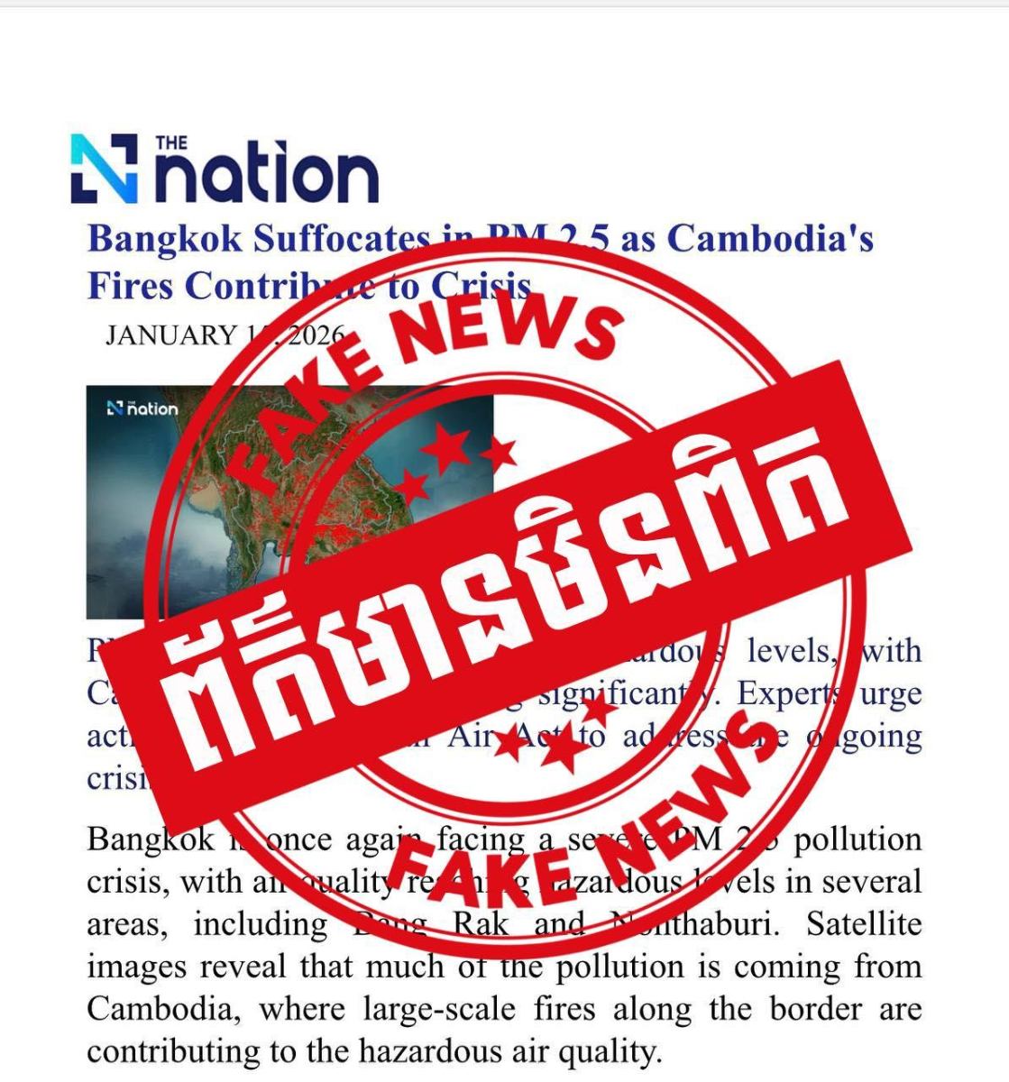 ភ្នំពេញ៖ ក្រសួងបរិស្ថាននៃព្រះរាជាណាចក្រកម្ពុជា កាលពីថ្ងៃទី១៥ ខែមករា ឆ្នាំ២០២៦ បានចេញសេចក្ដីប្រកាសព័ត៌មាន បដិសេធចំពោះការផ្សាយចោទប្រកាន់របស់កាសែតថៃ The Nation ដែលបាន លើកឡើងថា ការបំពុលខ្យល់នៅទីក្រុងបាងកក មានប្រភពមកពីភ្លើងឆេះនៅក្នុងប្រទេសកម្ពុជា។