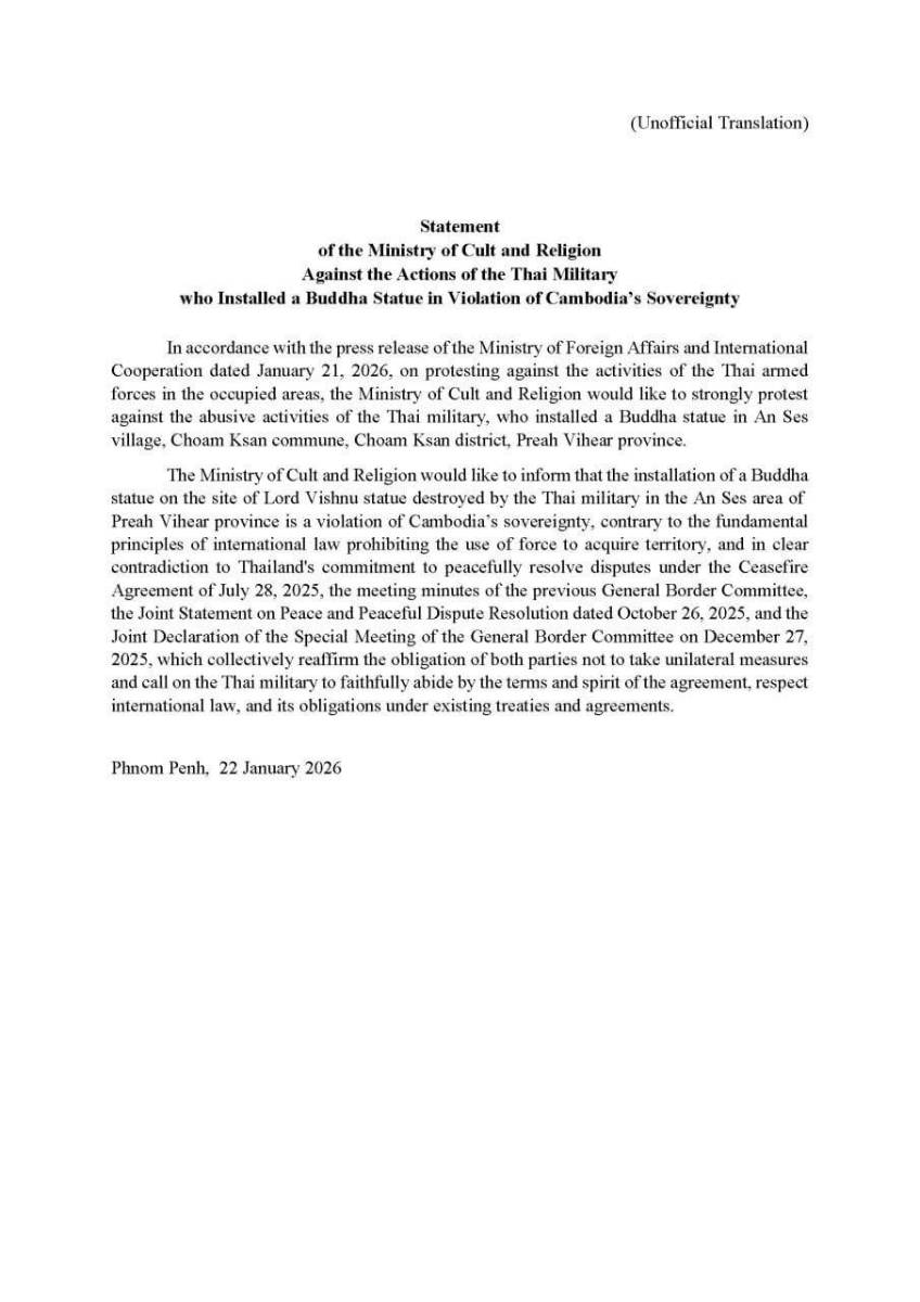 ក្រសួងធម្មការ និងសាសនា អះអាងថា ការតម្កល់រូបសំណាកព្រះពុទ្ធប្បដិមានៅលើទីតាំងរូបសំណាក បដិមាព្រះវិស្ណុ ដែលត្រូវបានបំផ្លាញដោយយោធាថៃ នៅតំបន់អានសេះ ខេត្តព្រះវិហារ គឺជាការរំលោភបំពានមកលើ ដែនអធិបតេយ្យភាពកម្ពុជា ផ្ទុយទៅនឹងគោលការណ៍ជាមូលដ្ឋាននៃច្បាប់អន្តរជាតិ ដែលហាមឃាត់ការកាន់កាប់យកទឹកដីដោយប្រើប្រាស់កម្លាំង និងផ្ទុយស្រឡះទៅនឹងការប្តេជ្ញាចិត្តរបស់ថៃ ក្នុងការដោះស្រាយវិវាទដោយសន្តិវិធី ក្រោមកិច្ចព្រមព្រៀងបទឈប់បាញ់ នាថ្ងៃទី២៨ ខែកក្កដា ឆ្នាំ២០២៥ កំណត់ហេតុនៃកិច្ចប្រជុំគណៈកម្មាធិការ ព្រំដែនទូទៅ នាពេលកន្លងមក សេចក្តីថ្លែងការណ៍រួមស្តីពីសន្តិភាពនិងដំណោះស្រាយវិវាទដោយសន្តិវិធី ចុះថ្ងៃទី២៦ ខែតុលា ឆ្នាំ២០២៥ និងសេចក្តីប្រកាសរួមនៃកិច្ចប្រជុំពិសេសរបស់គណៈកម្មាធិការព្រំដែនទូទៅ នៅថ្ងៃទី២៧ ខែធ្នូ ឆ្នាំ២០២៥ ដែលបញ្ជាក់ជារួមអំពីកាតព្វកិច្ចរបស់ភាគីទាំងពីរ ក្នុងការមិនអនុវត្តវិធានការជាឯកតោភាគី និងសូមឱ្យ យោធាថៃចូលរួមគោរពដោយស្មោះត្រង់ចំពោះលក្ខខណ្ឌនិងស្មារតីនៃកិច្ចព្រមព្រៀង គោរពច្បាប់អន្តរជាតិ និងកាតព្វកិច្ចរបស់ខ្លួនក្រោមសន្ធិសញ្ញានិងកិច្ចព្រមព្រៀងដែលមានស្រាប់៕