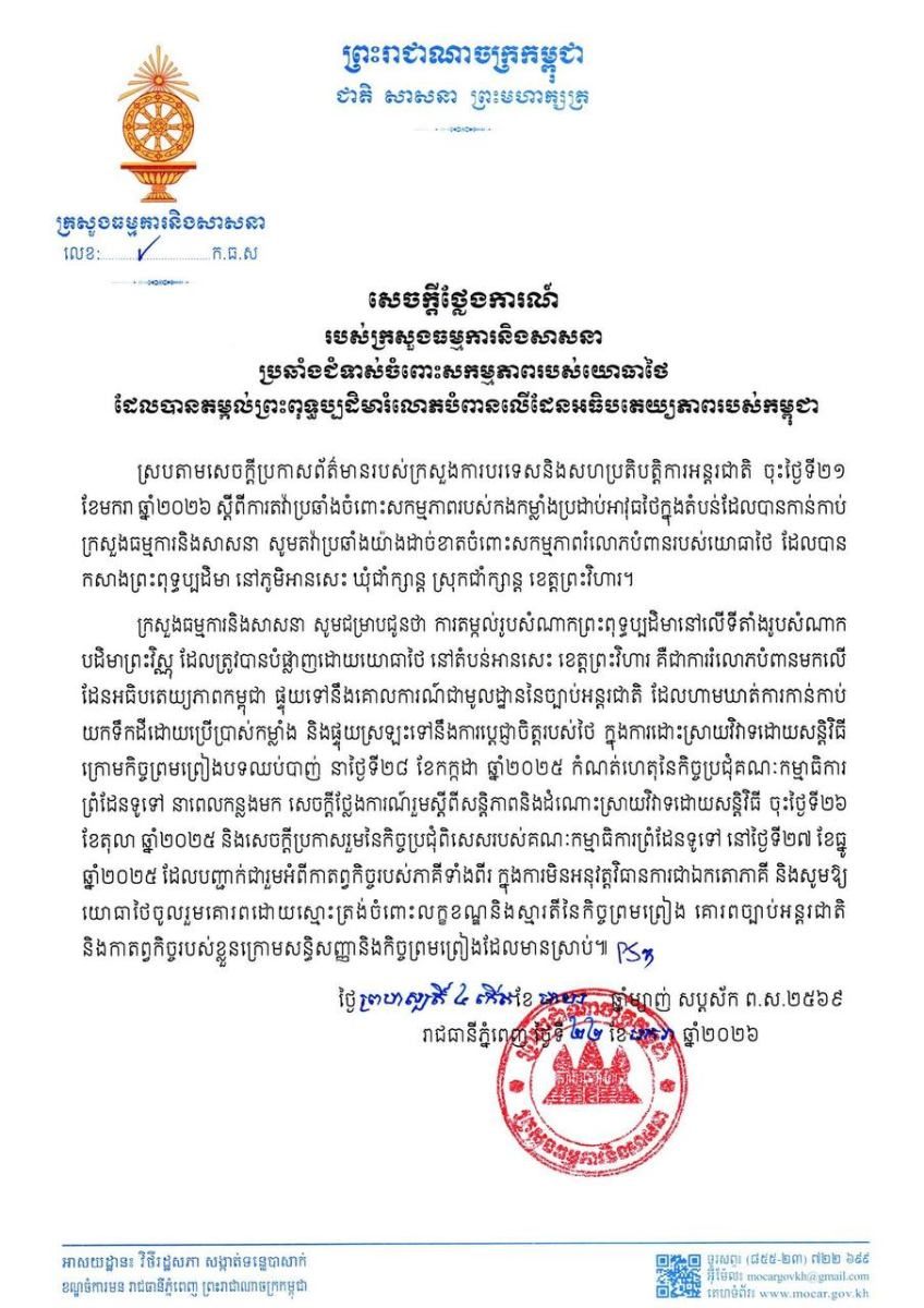 ភ្នំពេញ៖ ក្រសួងធម្មការ និងសាសនា នៃព្រះរាជាណាចក្រកម្ពុជា នៅថ្ងៃទី២២ ខែមករា ឆ្នាំ២០២៦នេះ បានចេញ សេចក្តីថ្លែងការណ៍របស់ ប្រឆាំងជំទាស់ចំពោះសកម្មភាពរបស់យោធាថៃ ដែលបានតម្កល់ព្រះពុទ្ធប្បដិមារំលោភបំពានលើដែនអធិបតេយ្យភាពរបស់កម្ពុជា។