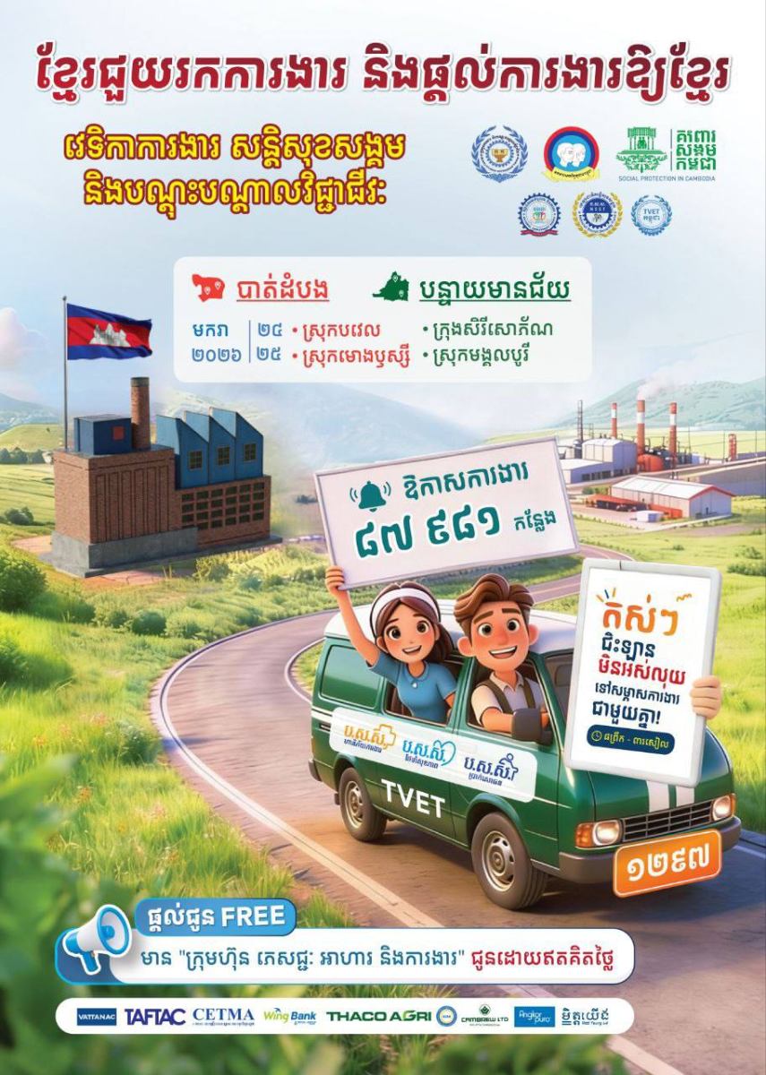 ក្រសួងការងារ និងបណ្តុះបណ្តាលវិជ្ជាជីវៈ នឹងបន្តបើកយុទ្ធនាការចុះផ្សព្វផ្សាយព័ត៌មានអំពីឱកាសការងារ សន្តិសុខសង្គម និងបណ្តុះបណ្តាលវិជ្ជាជីវៈ ចាប់ពីថ្ងៃទី២៤ ខែមករា រហូតដល់ខែឧសភា ឆ្នាំ២០២៦ នៅខេត្តបាត់ដំបង និងខេត្តបន្ទាយមានជ័យ ដើម្បីជួយសម្រួលដល់ការរកការងារធ្វើដល់ប្រជាពលរដ្ឋ ជាពិសេសអតីតពលករខ្មែរត្រឡប់មកពីប្រទេសថៃ ខណៈមកទល់ពេលនេះមានពលករត្រឡប់ពីថៃជាង៦០ម៉ឺននាក់ហើយដែលទទួលបានឱកាសការងារធ្វើ។
