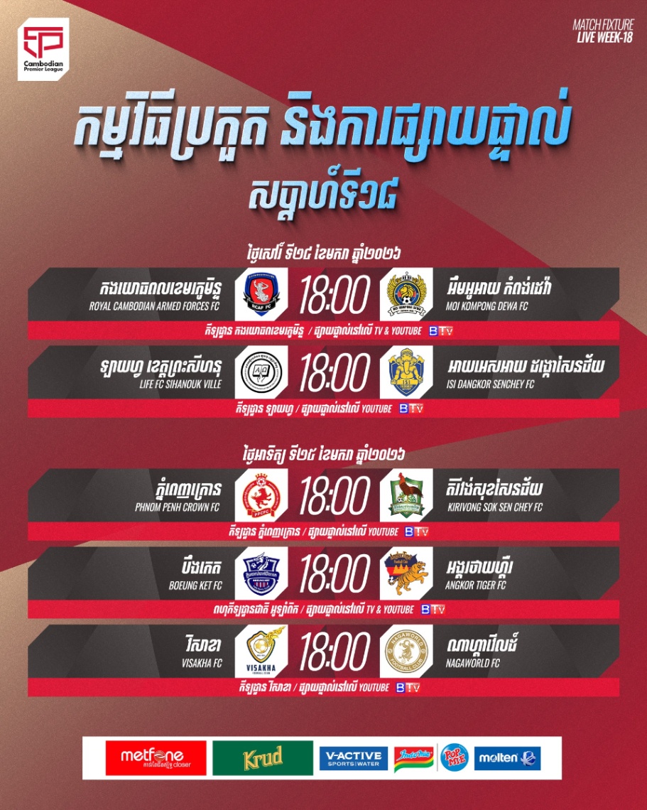 ក្រុមកំពូលតារាងព្រះខ័នរាជស្វាយរៀង នឹងមិនមានកម្មវិធីប្រកួតនោះទេ នាចុងសប្ដាហ៍នេះ តែបេក្ខភាព ១០ក្រុមផ្សេងទៀត នឹងត្រូវធ្វើការប្រកួតធម្មតា ពិសេសក្រុមកំពូលតារាងទាំង ៦(Top-6) ដែលភាគច្រើនត្រូវជួបគ្នា ក្នុងសប្ដាហ៍ទី១៨ នៃលីគកំពូលកម្ពុជា ឆ្នាំ២០២៥/២៦។