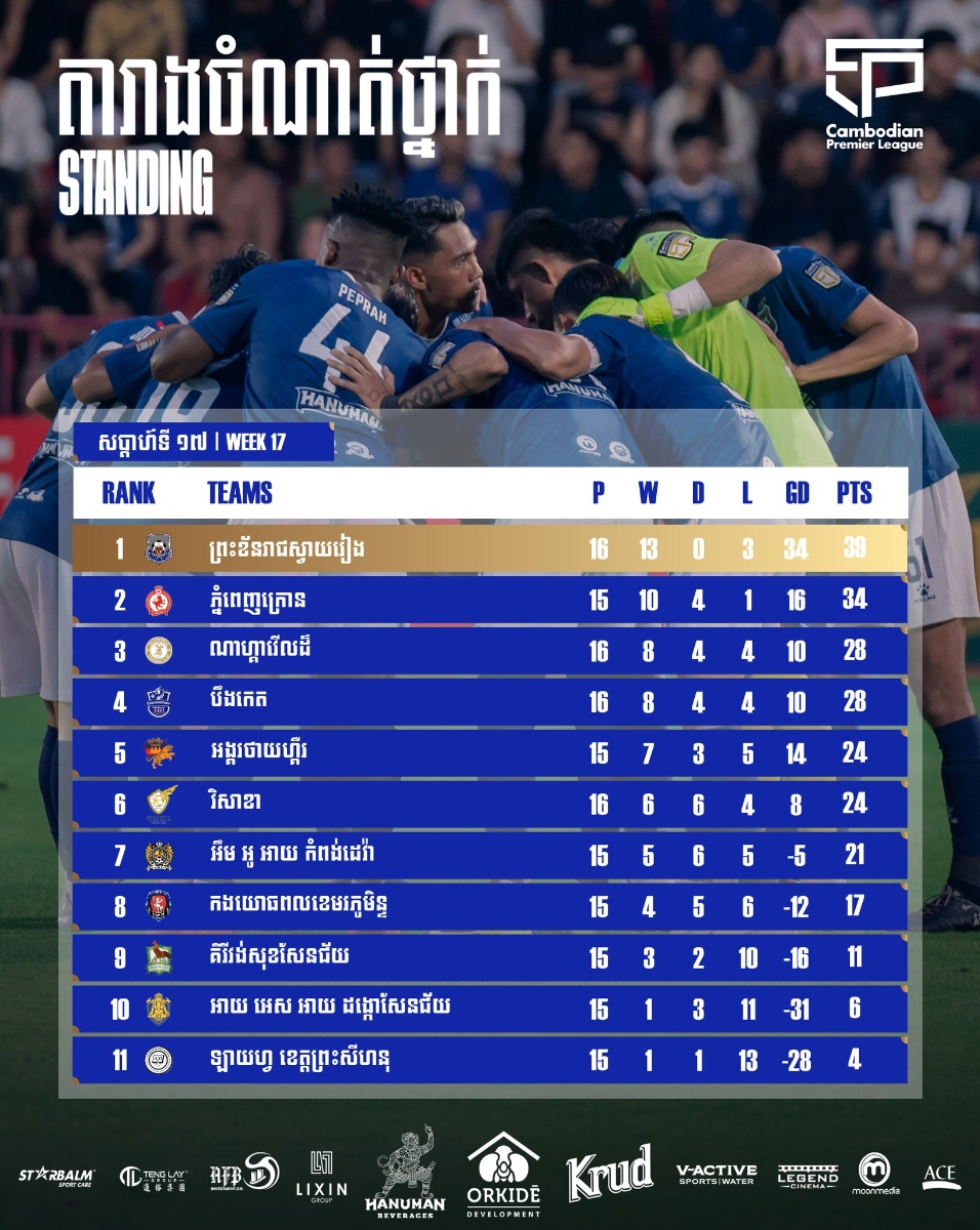 បច្ចុប្បន្នភ្នំពេញក្រោន កំពុងឈរលេខ២ មាន ៣៤ពិន្ទុ តាមពីក្រោយព្រះខ័នរាជស្វាយរៀង ៥ពិន្ទុ តែសល់ ១ប្រកួតក្នុងដៃ គ្រាដែលណាហ្គាវើលដ៏ ឈរលេខ៣ មាន ២៨ពិន្ទុស្មើបឹងកេត ដែលឈរលេខ៤ គ្រាដែលអង្គរថាយហ្គឺរ មាន ២៤ពិន្ទុ ឈរលេខ៥ ស្មើវិសាខា ដែលឈរលេខ៦។ ផ្អែកលើលទ្ធផលបណ្ដោះអាសន្ននេះ ក្រុមនីមួយៗ សុទ្ធតែត្រូវការពិន្ទុ ដើម្បីរក្សាកៅអី Top-6 ក៏ដូចជាបង្កើនឱកាសប្រជែងពាន ពិសេសអង្គរថាយហ្គឺរ និងវិសាខា ដែលកំពុងស្ថិតក្នុងតំណែង Top-6 ទាំងប្រផិតប្រផើយនៅឡើយ។