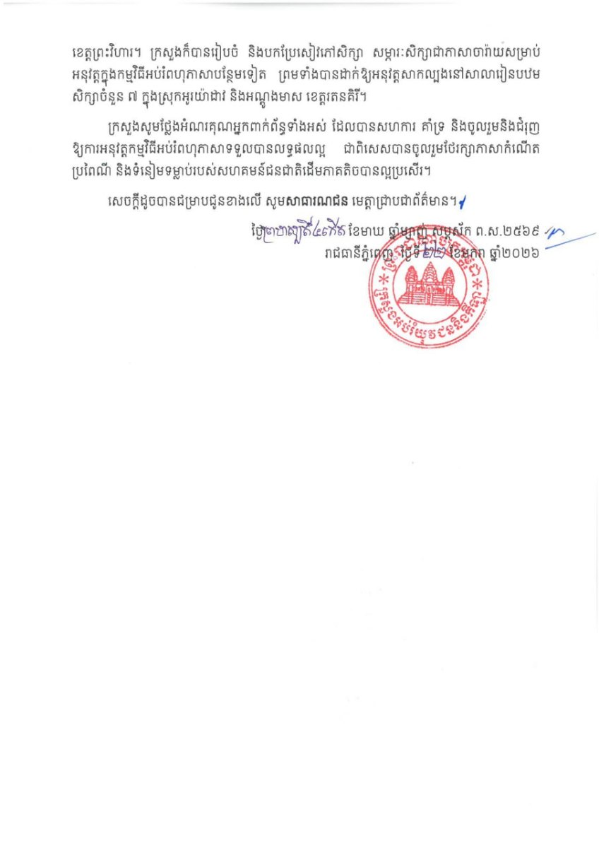 ក្រសួងបានថ្លែងអំណរគុណអ្នកពាក់ព័ន្ធទាំងអស់ ដែលបានសហការ គាំទ្រ និងចូលរួមនិងជំរុញ ឱ្យការអនុវត្តកម្មវិធីអប់រំពហុភាសាទទួលបានលទ្ធផលល្អ ជាពិសេសបានចូលរួមថែរក្សាភាសាកំណើត ប្រពៃណី និងទំនៀមទម្លាប់របស់សហគមន៍ជនជាតិដើមភាគតិចបានល្អប្រសើរ៕
