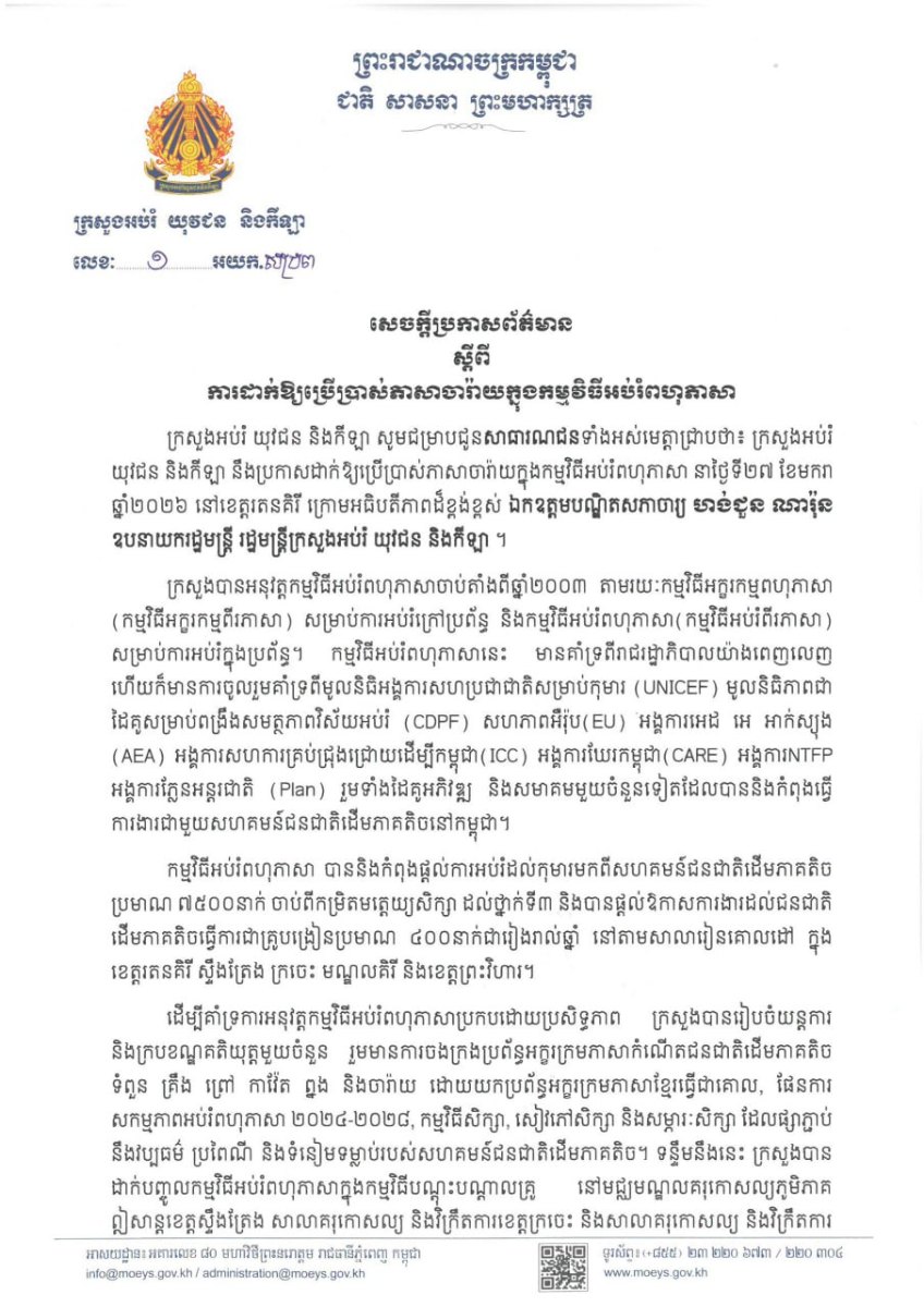 ក្រសួងអប់រំ យុវជន និងកីឡា នឹងប្រកាសដាក់ឱ្យប្រើប្រាស់ភាសាចារ៉ាយក្នុងកម្មវិធីអប់រំពហុភាសា នាថ្ងៃទី២៧ ខែមករា ឆ្នាំ២០២៦ នៅខេត្តរតនគិរី ក្រោមអធិបតីភាពដ៏ខ្ពង់ខ្ពស់ ឯកឧត្តមបណ្ឌិតសភាចារ្យ ហង់ជួន ណារ៉ុន ឧបនាយករដ្ឋមន្ត្រី រដ្ឋមន្ត្រីក្រសួងអប់រំ យុវជន និងកីឡា ។