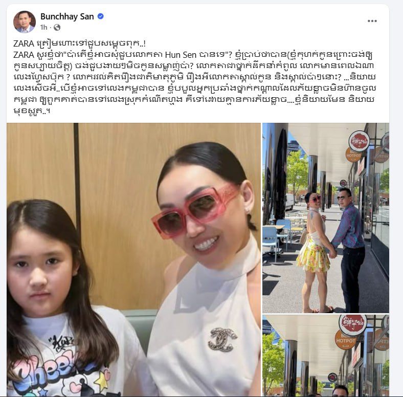 សម្ដេចតេជោ ហ៊ុន សែន បានបញ្ជាក់បែបនេះ ដោយបានភ្ជាប់ជាមួយសាររបស់លោក សាន ប៊ុនឆាយ ដោយបានសរសេរនៅលើបណ្ដាញសង្គមហ្វេសប៊ុករបស់លោកថា ZARA សួរខ្ញុំថា «ប៉ាតើខ្ញុំអាចសុំជួបលោកតា Hun Sen បានទេ»? ខ្ញុំប្រាប់ថាបាន(ខ្ញុំកុហក់កូនព្រោះចង់ឲ្យកូនសប្បាយចិត្ត) ចង់ជួបងាយៗមិចកូនសម្លាញ់ប៉ា? លោកតាជាថ្នាក់ដឹកនាំកំពូល លោកមានពេលឯណាលេងហ្វែសប៊ុក ? លោករវល់គិតរឿងជាតិមាតុភូមិ រឿងអីលោកតាស្គាល់កូន និងស្គាល់ប៉ាៗនោះ? …និយាយលេងសើចអី..បើខ្ញុំអាចទៅលេងកម្ពុជាបាន ខ្ញុំបបួលអ្នកប្រឆាំងថ្នាក់កណ្តាលដែលភ័យខ្លាចមិនហ៊ានចូលកម្ពុជា ឲ្យពួកគាត់បានទៅលេងស្រុកកំណើតហ្មង គឺទៅដោយគ្មានការភ័យខ្លាច….ខ្ញុំនិយាយមែន និយាយមុខស្ងួត..៕