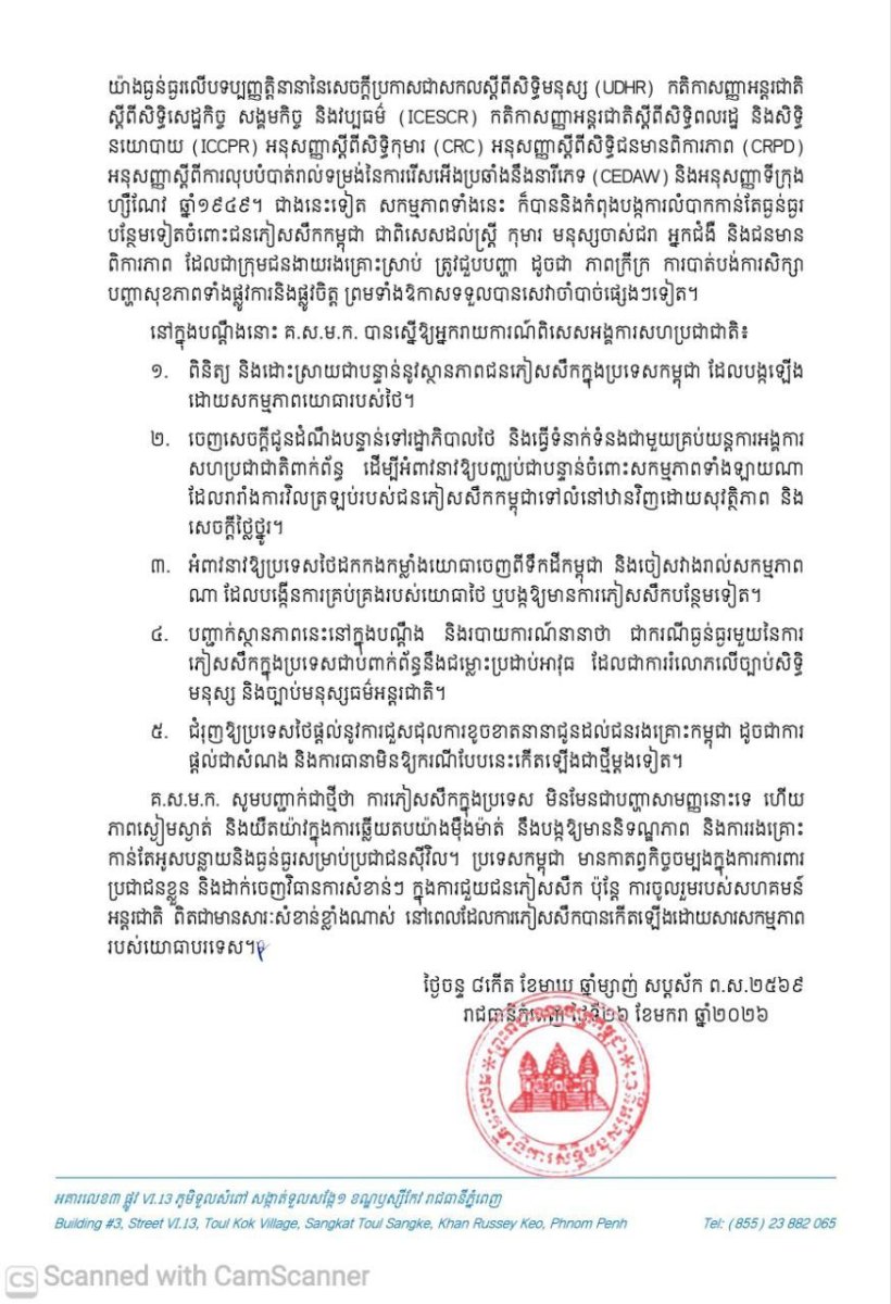 គ.ស.ម.ក. គូសបញ្ជាក់ថា ការចូលមកកាន់កាប់ដោយខុសច្បាប់ ការបំផ្លិចបំផ្លាញផ្ទះសម្បែង ការលួចទ្រព្យសម្បត្តិជនស៊ីវិល និងការរារាំងក្នុងការវិលត្រឡប់ទៅលំនៅឋានរបស់ខ្លួនវិញ គឺជាការរំលោភយ៉ាងធ្ងន់ធ្ងរលើបទប្បញ្ញត្តិនានានៃសេចក្តីប្រកាសជាសកលស្តីពីសិទ្ធិមនុស្ស (UDHR) កតិកាសញ្ញាអន្តរជាតិ ស្តីពីសិទ្ធិសេដ្ឋកិច្ច សង្គមកិច្ច និងវប្បធម៌ (ICESCR) កតិកាសញ្ញាអន្តរជាតិស្តីពីសិទ្ធិពលរដ្ឋ និងសិទ្ធិ នយោបាយ (ICCPR) អនុសញ្ញាស្តីពីសិទ្ធិកុមារ (CRC) អនុសញ្ញាស្តីពីសិទ្ធិជនមានពិការភាព (CRPD) អនុសញ្ញាស្តីពីការលុបបំបាត់រាល់ទម្រង់នៃការរើសអើងប្រឆាំងនឹងនារីភេទ (CEDAW) និងអនុសញ្ញាទីក្រុង ហ្សឺណែវ ឆ្នាំ១៩៤៩។ ជាងនេះទៀតសកម្មភាពទាំងនេះក៏បាននិងកំពុងបង្កការលំបាកកាន់តែធ្ងន់ធ្ងរ បន្ថែមទៀតចំពោះជនភៀសសឹកកម្ពុជា ជាពិសេសដល់ស្ត្រី កុមារ មនុស្សចាស់ជរា អ្នកជំងឺ និងជនមាន ពិការភាព ដែលជាក្រុមជនងាយរងគ្រោះស្រាប់ ត្រូវជួបបញ្ហា ដូចជា ភាពក្រីក្រ ការបាត់បង់ការសិក្សា បញ្ហាសុខភាពទាំងផ្លូវកាយ និងផ្លូវចិត្ត ព្រមទាំងឱកាសទទួលបានសេវាចាំបាច់ផ្សេងៗទៀត។