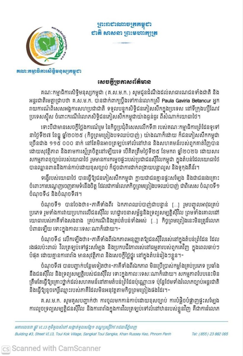 យោងតាមសេចក្តីប្រកាសព័ត៌មានរបស់គណៈកម្មាធិការសិទ្ធិមនុស្សកម្ពុជា (គ.ស.ម.ក.) ចេញផ្សាយកាលពីថ្ងៃទី២៧ ខែមករា ឆ្នាំ២០២៦នេះ បានឱ្យដឹងថា ទោះបីជាមានសេចក្តីថ្លែងការណ៍រួមនៃកិច្ចប្រជុំពិសេសលើកទី៣ របស់គណៈកម្មាធិការព្រំដែនទូទៅ នាថ្ងៃទី២៧ ខែធ្នូ ឆ្នាំ២០២៥ (កិច្ចព្រមព្រៀងបទឈប់បាញ់) យ៉ាងណាក៏ដោយក៏ជនភៀសសឹកកម្ពុជា ច្រើនជាង ១១៥ ០០០នាក់ នៅតែមិនអាចត្រឡប់ទៅលំនៅឋាន និងសហគមន៍របស់ពួកគាត់វិញបាន ដោយសុវត្ថិភាព និងតាមការស្ម័គ្រចិត្តនៅឡើយទេ បើគិតត្រឹមថ្ងៃទី២៥ ខែមករា ឆ្នាំ២០២៦ ដោយសារសកម្មភាពខុសច្បាប់របស់យោធាថៃ រួមមានការកម្ទេចផ្ទះរបស់ប្រជាជនស៊ីវិលកម្ពុជា ក្នុងតំបន់ដែលយោធាថៃ បានឈ្លានពាន និងកាន់កាប់ដោយខុសច្បាប់ ក៏ដូចជាការដាក់ពង្រាយបន្លាលួស និងទូកុងតឺន័រ។