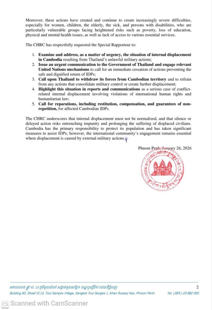 គណៈកម្មាធិការសិទ្ធិមនុស្សកម្ពុជា (គ.ស.ម.ក.) បានដាក់ពាក្យប្ដឹងទៅកាន់ លោកស្រី Paula Gaviria Betancur អ្នករាយការណ៍ពិសេសអង្គការសហប្រជាជាតិ ទទួលបន្ទុកសិទ្ធិជនភៀសសឹកក្នុងប្រទេស នៅទីក្រុងហ្សឺណែវ ប្រទេសស្វីស ចំពោះករណីរំលោភសិទ្ធិជនភៀសសឹកកម្ពុជាយ៉ាងធ្ងន់ធ្ងរពីសំណាក់យោធាថៃ។