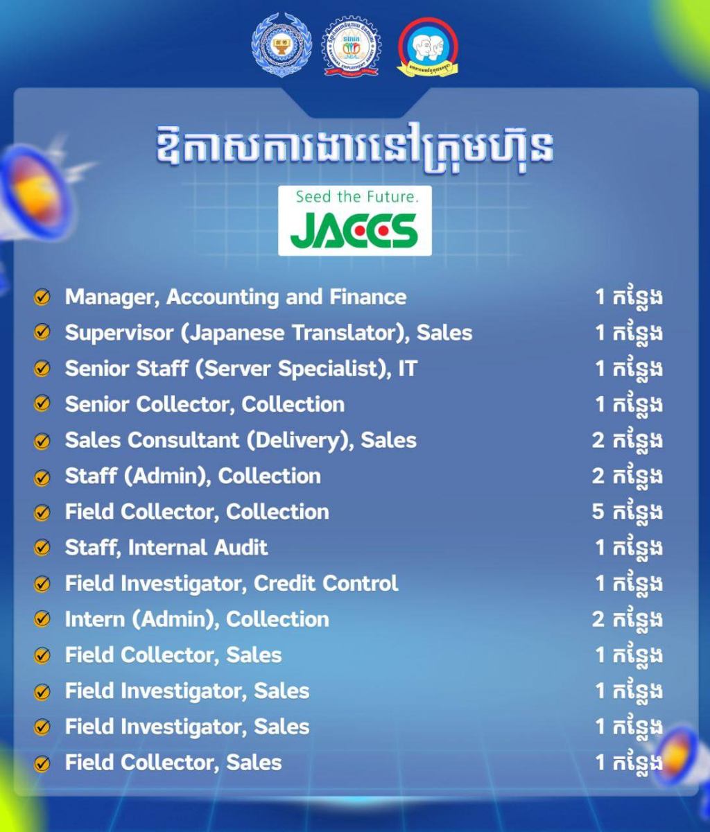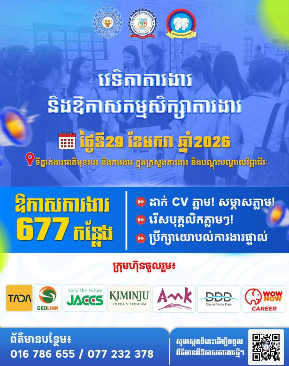 ទីភ្នាក់ងារជាតិមុខរបរ និងការងារ (NEA) នៃក្រសួងការងារ និងបណ្តុះបណ្តាលវិជ្ជាជីវៈ សហការជាមួយសហភាពសហព័ន្ធយុវជនកម្ពុជាវិស័យការងារ សន្តិសុខសង្គម និងបណ្តុះបណ្តាលវិជ្ជាជីវៈ នឹងរៀបចំវេទិកាការងារ និងកម្មសិក្សាការងារ នៅថ្ងៃទី២៩ ខែមករា ឆ្នាំ២០២៦ ស្អែកនេះ ដោយនាំយកឱកាសការងារថ្មីបន្ថែមទៀត ចំនួន៦៧៧កន្លែង ពីក្រុមហ៊ុនធំៗចំនួន៧ សម្រាប់ផ្តល់ជូនយុវជន សិស្ស/និស្សិត និងអ្នកកំពុងស្វែងរកការងារធ្វើ។