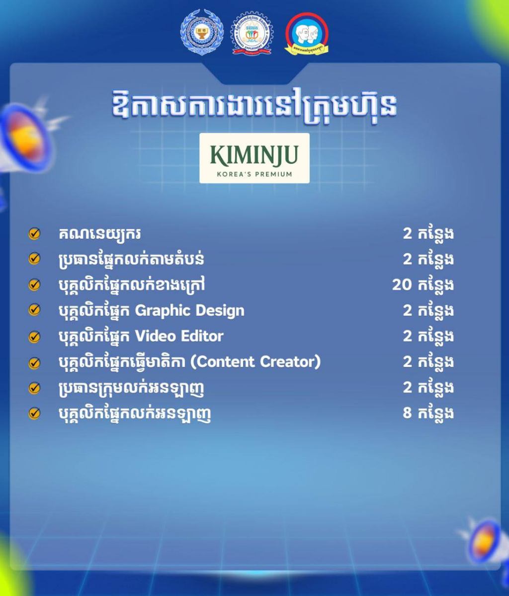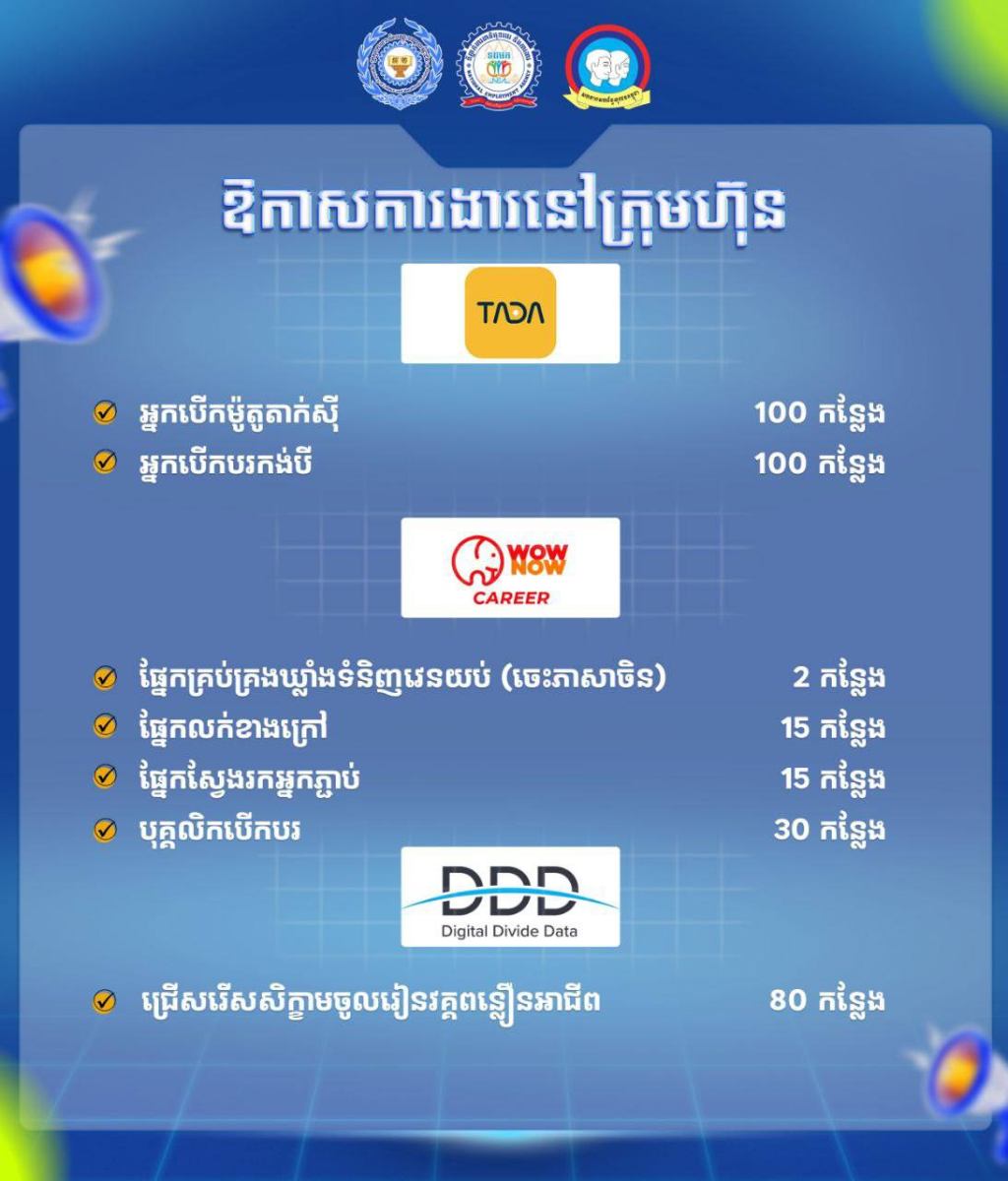 ទីភ្នាក់ងារជាតិមុខរបរ និងការងារ បានបញ្ជាក់ថា ក្រុមហ៊ុនធំៗទាំង៧ ដែលនឹងចូលរួមក្នុងវេទិកាការងារនេះ មានដូចជា៖ គ្រឹះស្ថានមីក្រូហិរញ្ញវត្ថុ AMK,គ្រឹះស្ថានមីក្រូហិរញ្ញវត្ថុ ជេកស៍ (ខេមបូឌា) ឯ.ក, ក្រុមហ៊ុន គីមអ៊ីនជូ ឯ.ក, អង្គការប្រព័ន្ធទិន្ន័យកម្ពុជា (DDD), ក្រុមហ៊ុន អិមវីអិល តារា (ខេមបូឌា) ឯ.ក, ក្រុមហ៊ុន ជីអូលីង គ្រុប និងក្រុមហ៊ុន យូ ឡាយហ្វ៍ ខេអេច ស៊ូភើ អាប់ ឯ.ក (WOWNOW)។