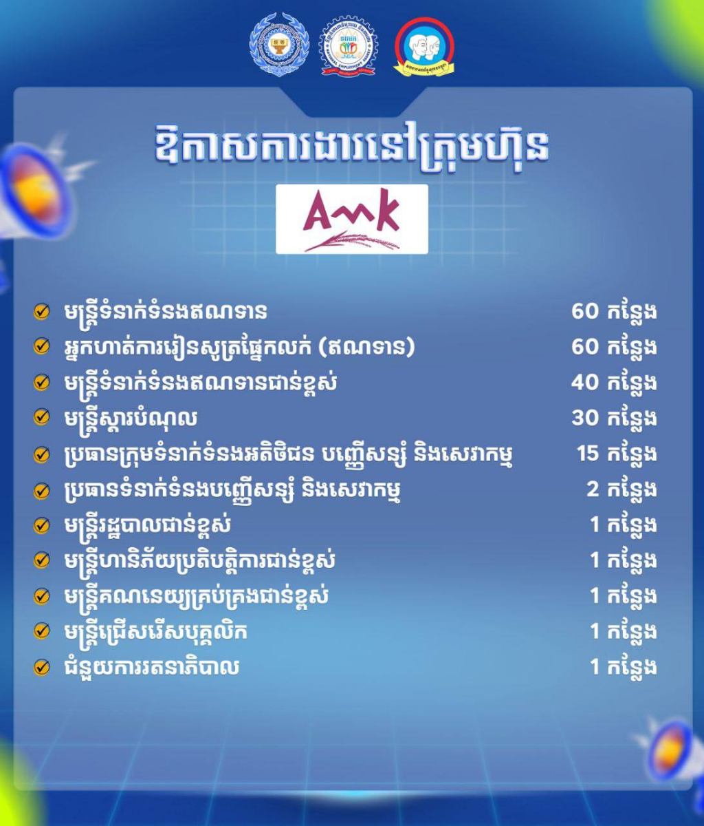 ទីភ្នាក់ងារជាតិមុខរបរ និងការងារ បានអំពាវនាវដល់យុវជន សិស្ស/និស្សិត និងអ្នកកំពុងតែស្វែងរកការងារធ្វើ ឬចង់ផ្លាស់ប្តូរការងារ អាចយកប្រវត្តិរូបសង្ខេប (CV) ដើម្បីចូលរួមដាក់ពាក្យ និងសម្ភាសផ្ទាល់ជាមួយតំណាងក្រុមហ៊ុនទាំងនោះបាន នៅក្នុងបរិវេណក្រសួងការងារ និងបណ្តុះបណ្តាលវិជ្ជាជីវៈ ចាប់ពីពេលព្រឹកម៉ោង៨ រហូតដល់ម៉ោង៥ល្ងាច៕