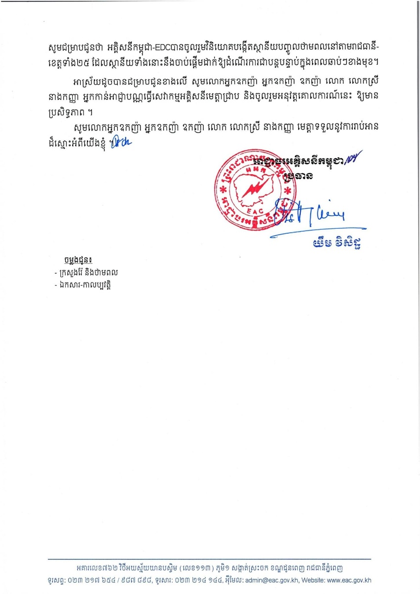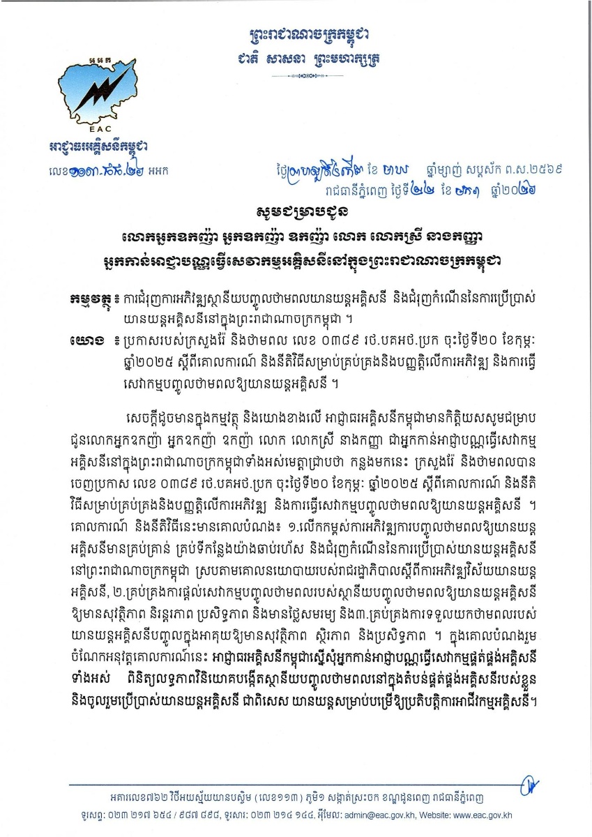 អាជ្ញាធរអគ្គិសនីកម្ពុជា បានជម្រាបជូនលោកអ្នកឧកញ៉ា អ្នកឧកញ៉ា ឧកញ៉ា លោក លោកស្រី នាងកញ្ញ អ្នកកាន់អាជ្ញាបណ្ណ ធ្វើសេវាកម្មអគ្គិសនី នៅក្នុងព្រះរាជាណាចក្រកម្ពុជា ការជំរុញការអភិវឌ្ឍស្ថានីយបញ្ចូលថាមពលយានយន្តអគ្គិសនី និងជំរុញកំណើន នៃការប្រើប្រាស់យានយន្តអគ្គិសនីនៅក្នុងព្រះរាជាណាចក្រកម្ពុជា។