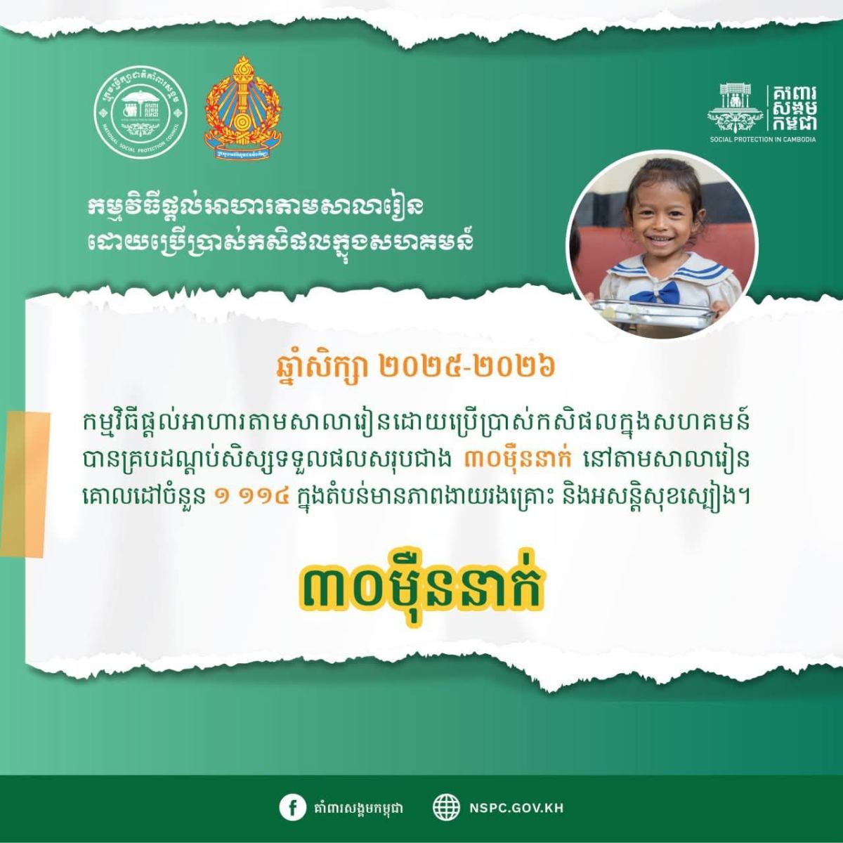 ឯកឧត្តមបណ្ឌិត ចន ណារិទ្ធ រដ្ឋលេខាធិការក្រសួងសេដ្ឋកិច្ច និងហិរញ្ញវត្ថុ និងជាអគ្គលេខាធិការក្រុមប្រឹក្សាជាតិគាំពារសង្គម បានឱ្យដឹងនៅថ្ងៃទី២៨ ខែមករា ឆ្នាំ២០២៦ នេះថា គិតត្រឹមដើមឆ្នាំ ២០២៦នេះ កម្មវិធីផ្តល់អាហារតាមសាលារៀនដោយប្រើប្រាស់កសិផលក្នុងសហគមន៍ បាន និងកំពុងអនុវត្តតាមសាលារៀនគោលដៅចំនួន ១ ១១៤ ក្នុងតំបន់មានភាពងាយរងគ្រោះ និងអសន្តិសុខស្បៀង ដោយក្នុងនោះ ក្រសួងអប់រំ យុវជន និងកីឡា អនុវត្តកម្មវិធីនេះនៅសាលារៀនគោលដៅចំនួន ៨១៦ ដោយប្រើប្រាស់ថវិកាជាតិ និងសាលារៀនគោលដៅចំនួន ២៩៨ ផ្សេងទៀត កំពុងអនុវត្តដោយកម្មវិធីស្បៀងអាហារពិភពលោក (WFP)។ កម្មវិធីនេះ កំពុងត្រូវបានអនុវត្តតាមបណ្ដាខេត្តចំនួន ១០ រួមមាន ខេត្តសៀមរាប, កំពង់ធំ, ព្រះវិហារ, បាត់ដំបង, ស្ទឹងត្រែង, បន្ទាយមានជ័យ, កំពង់ចាម, កំពង់ឆ្នាំង, ពោធិ៍សាត់, និងឧត្តរមានជ័យ ដោយមានសិស្សានុសិស្សទទួលផលសរុបចំនួនប្រមាណ ៣០ម៉ឺននាក់។