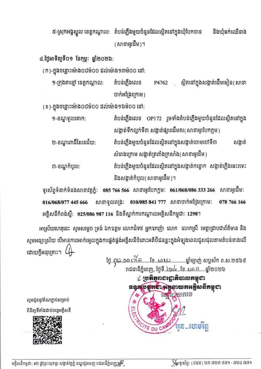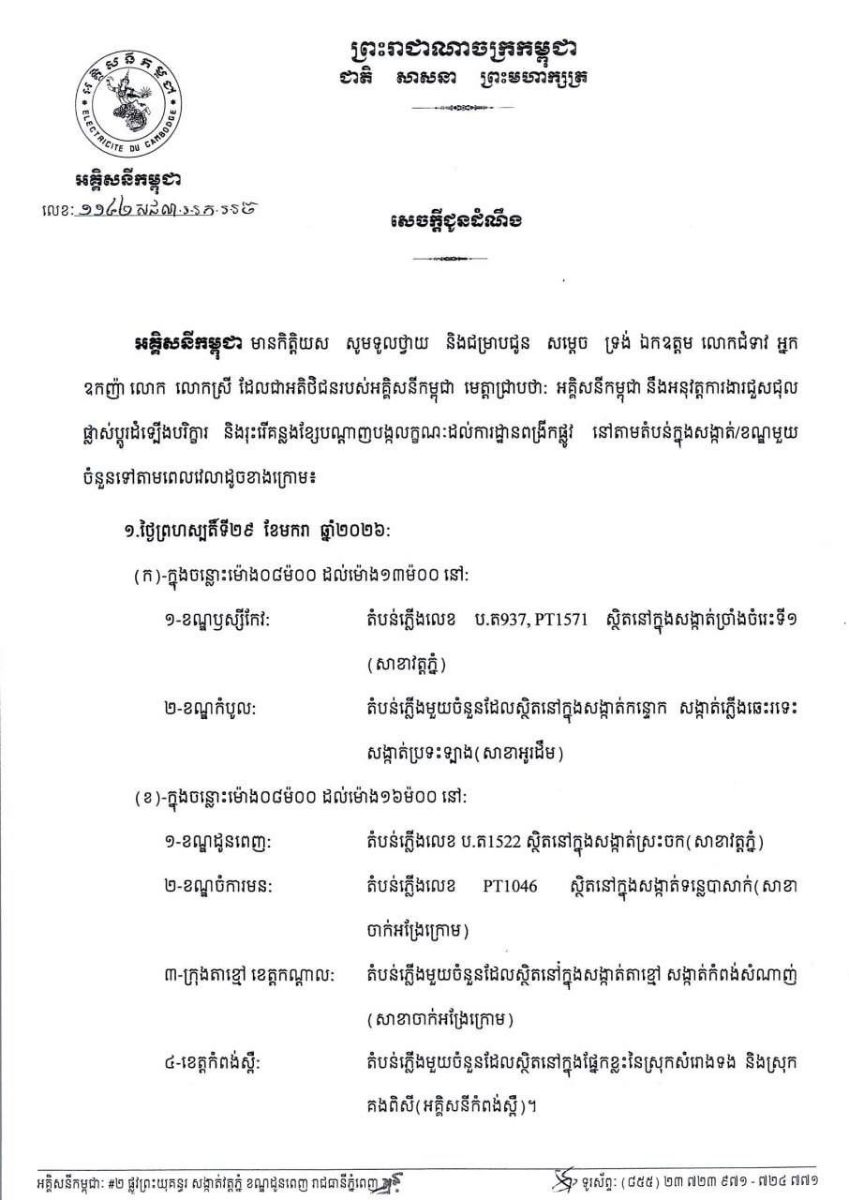 នៅថ្ងៃទី២៨ ខែមករា ឆ្នាំ២០២៦ នេះ អគ្គិសនីកម្ពុជា បានជូនសេចក្ដីជូនដំណឹងថា អគ្គិសនីកម្ពុជា នឹងអនុវត្តការងារជួសជុលផ្លាស់ប្ដូរដំឡើងបរិក្ខារ និងរុះរើគន្លងខ្សែបណ្ដាញបង្កលក្ខណៈដល់ការដ្ឋានពង្រីកផ្លូវ ចាប់ពីថ្ងៃទី២៩ ខែមករា ដល់ថ្ងៃទី១ ខែកុម្ភៈ ឆ្នាំ២០២៦ នេះ ចាប់ពីម៉ោង ៨:០០ព្រឹក ដល់ម៉ោង ១៣:០០ ឬម៉ោង ១៦:០០។