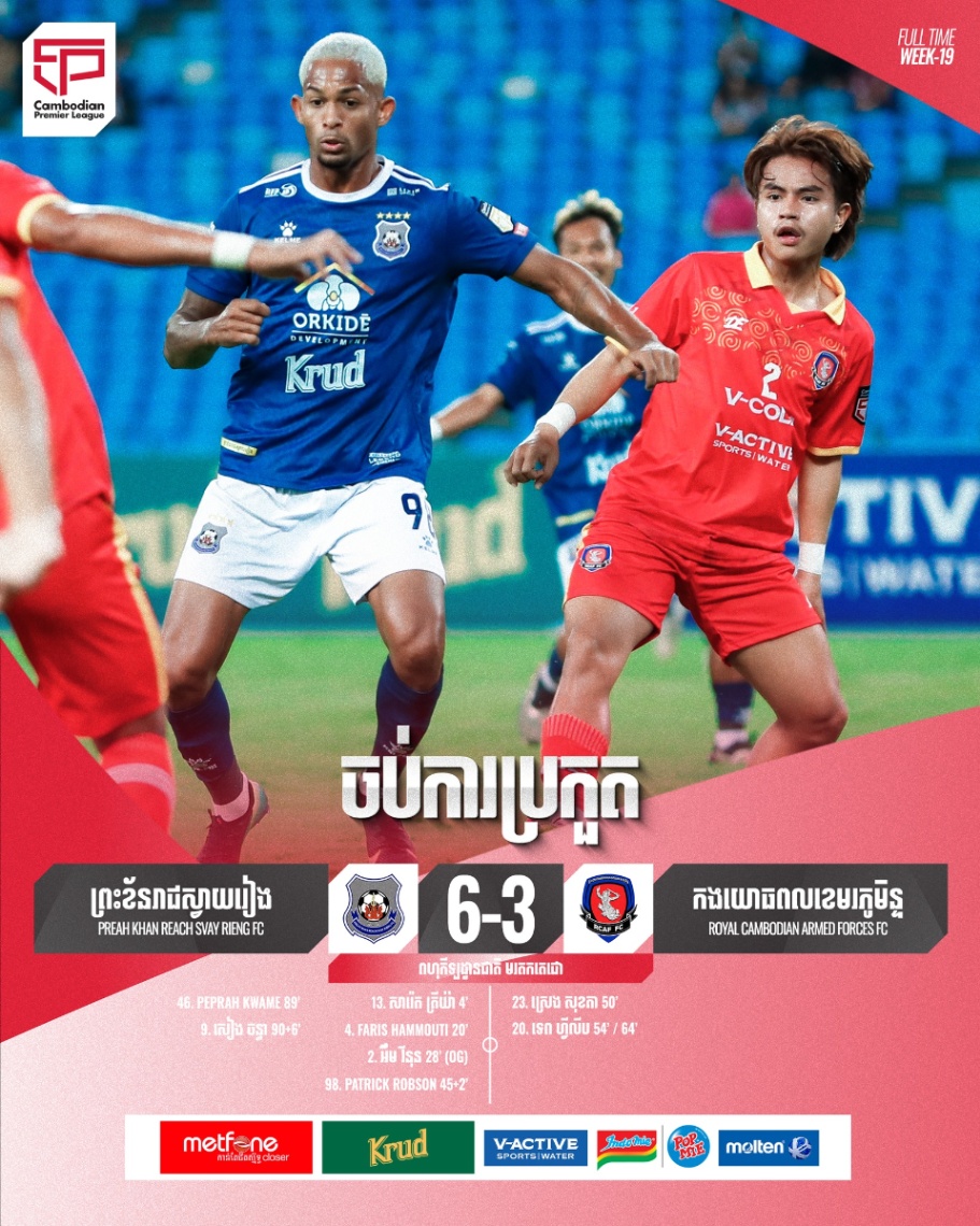 យ៉ាងនេះក្ដីព្រះខ័នរាជស្វាយរៀង នៅតែបន្តវាយសម្រុកទៅលើគូប្រកួត។ លុះនាទីទី៨៩កីឡាករដូរចូល ប៊ុត រដ្ឋា បញ្ជួនបាល់ស្ទើរឱ្យអ្នកចាំទីអ៊ុំ សេរីរ័ត្ន ហើយខ្សែប្រយុទ្ធ ព្រះខ័នរាជស្វាយរៀង Kwame Peprah ដណ្ដើមបាន និងទាត់បញ្ចូលទីបានសម្រេច។ ជិតចប់ការប្រកួតទៅហើយ ពោលនាទីទី៩០បូក៦ កីឡាករ សៀង ចន្ធា ក៏ទាត់បាល់បញ្ចូលទីគ្រាប់ទី៦ឱ្យក្រុម និងជាគ្រាប់បាល់ទី១របស់ខ្លួនក្នុងលីគកំពូលកម្ពុជារដូវកាល ២០២៥-២០២៦ ក្រោយដំណើរការបាន១៩សប្ដាហ៍។ លទ្ធផលនេះធ្វើឱ្យព្រះខ័នរាជស្វាយរៀងនៅបន្តកាន់កាប់កំពូលតារាង។