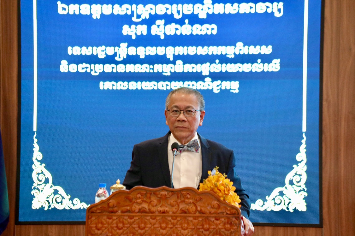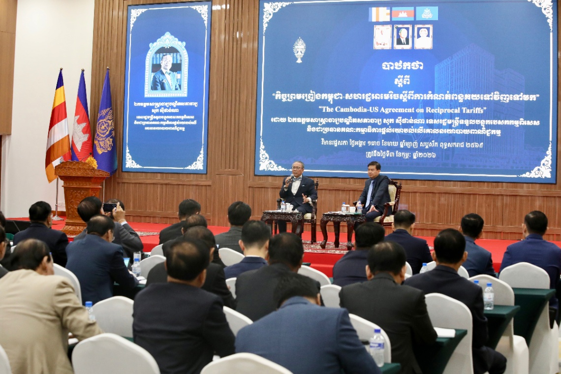ក្នុងបរិបទដែលពិភពលោកកំពុងតាមដានយ៉ាងយកចិត្តទុកដាក់ លើគោលនយោបាយសេដ្ឋកិច្ចរបស់មហាអំណាចសហរដ្ឋអាមេរិក នាព្រឹកថ្ងៃទី៣ ខែកុម្ភៈ ឆ្នាំ២០២៦ នៅវិមានរដ្ឋសភា ឯកឧត្តមសាស្ត្រាចារ្យបណ្ឌិតសភាចារ្យ សុក ស៊ីផាន់ណា ទេសរដ្ឋមន្ត្រីទទួលបន្ទុកបេសកកម្មពិសេស និងជាប្រធានគណៈកម្មការផ្តល់យោបល់លើគោលនយោបាយពាណិជ្ជកម្ម បានអញ្ជើញធ្វើជាវាគ្មិនកិត្តិយសក្នុងបាឋកថាដ៏មានសារៈសំខាន់ក្រោមប្រធានបទ “កិច្ចព្រមព្រៀងកម្ពុជា-សហរដ្ឋអាមេរិក ស្តីពីការកំណត់ពន្ធគយទៅវិញទៅមក” (The Cambodia-US Agreement on Reciprocal Tariffs)។