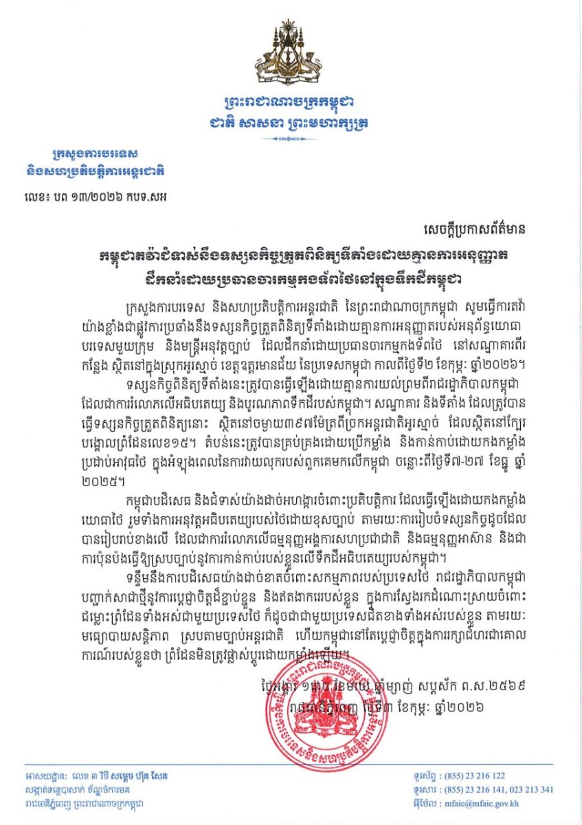 ភ្នំពេញ៖ ក្រសួងការបរទេស និងសហប្រតិបត្តិការអន្តរជាតិកម្ពុជា ធ្វើការតវ៉ាយ៉ាងខ្លាំងជាផ្លូវការប្រឆាំងនឹងទស្សនកិច្ចត្រួតពិនិត្យទីតាំងដោយគ្មានការអនុញ្ញាតរបស់អនុព័ន្ធយោធាបរទេសមួយក្រុម និងមន្ត្រីអនុវត្តច្បាប់ដែលដឹកនាំដោយប្រធានចារកម្មកងទ័ពថៃ នៅសណ្ឋាគារពីរកន្លែង ស្ថិតនៅក្នុងស្រុកអូរស្មាច់ ខេត្តឧត្តរមានជ័យ នៃប្រទេសកម្ពុជា កាលពីថ្ងៃទី២ ខែកុម្ភៈ ឆ្នាំ២០២៦។