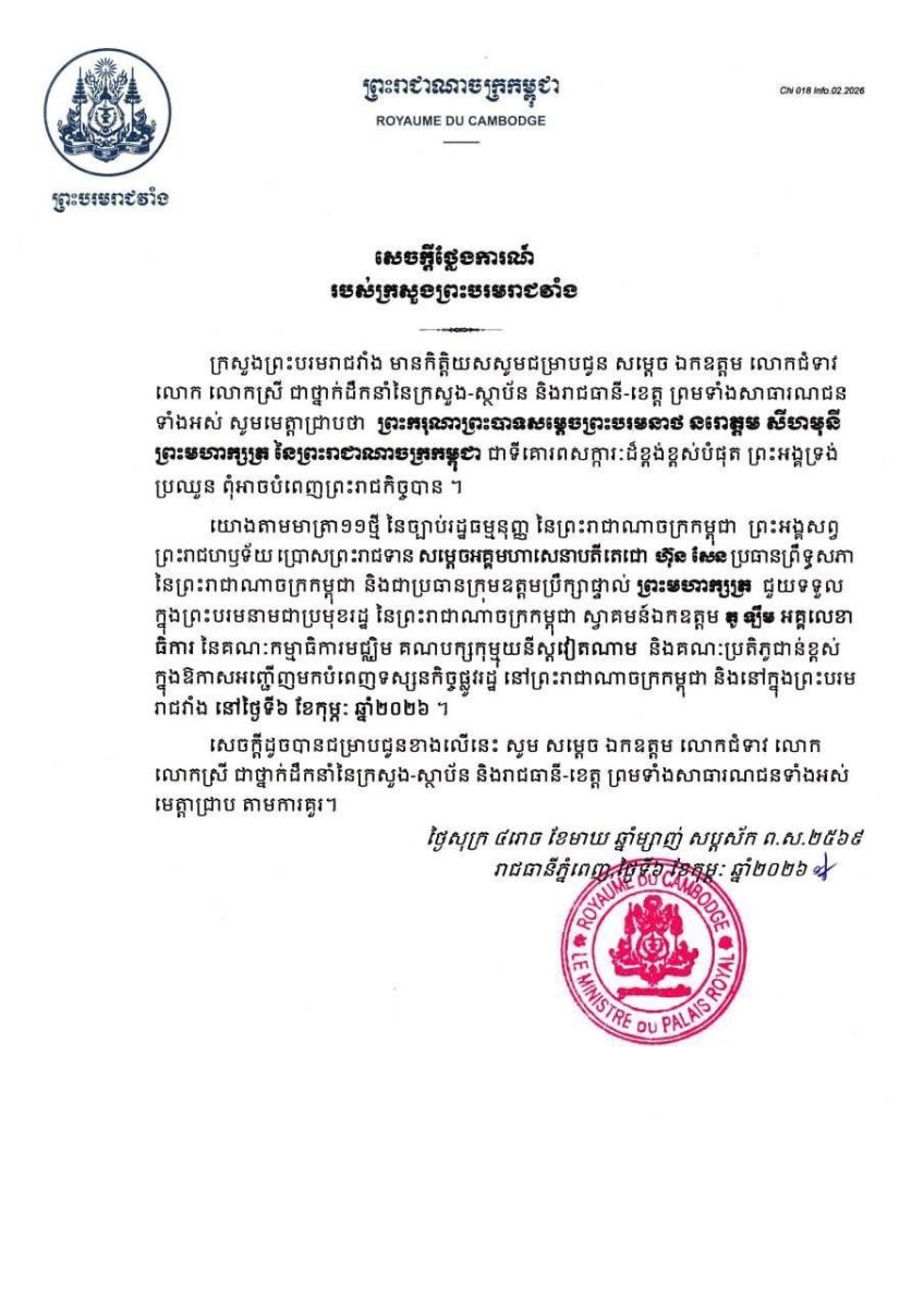 ភ្នំពេញ៖ ក្រសួងព្រះបរមរាជវាំង នៅព្រឹកថ្ងៃទី៦ ខែកុម្ភៈ ឆ្នាំ២០២៦នេះ បានចេញសេចក្តីថ្លែងការណ៍ដោយបញ្ជាក់ថា ព្រះមហាក្សត្រកម្ពុជា ព្រះអង្គទ្រង់ប្រឈួន ពុំអាចបំពេញព្រះរាជកិច្ចបាន ប្រគល់ភារកិច្ចជូនសម្តេចតេជោ ហ៊ុន សែន ជាប្រមុខរដ្ឋស្តីទី ឱ្យទទួលស្វាគមន៍ឯកឧត្ដម តូ ឡឹម អគ្គលេខាធិការបក្សកុម្មុយនីស្តវៀតណាម នៅក្នុងព្រះបរមរាជវាំង។