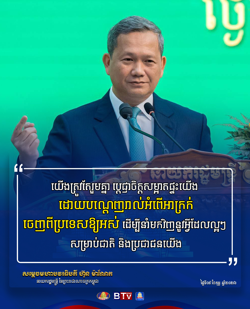 ក្នុងពិធីបិទសន្និបាទបូកសរុបលទ្ធផលការងាររបស់ក្រសួងមហាផ្ទៃ កាលពីម្សិលមិញ សម្តេចធិបតី ហ៊ុន ម៉ាណែត នាយករដ្ឋមន្ត្រី នៃកម្ពុជា បានបន្តដាក់បញ្ជាដោយគោលជំហរមុតមាំ ចំពោះអាជ្ញាធរឱ្យបោសសម្អាតអំពើឆបោកតាមប្រព័ន្ធអនឡាញ ដោយសម្តេចលើកឡើងថា « យើងត្រូវតែរួមគ្នាប្តេជ្ញាចិត្តសម្អាតផ្ទះយើង ដោយបណ្ដេញរាល់អំពើអាក្រក់ចេញពីប្រទេសឱ្យអស់ ដើម្បីនាំមកវិញនូវអ្វីដែលល្អៗ សម្រាប់ជាតិ និង ប្រជាជនយើង» ។
