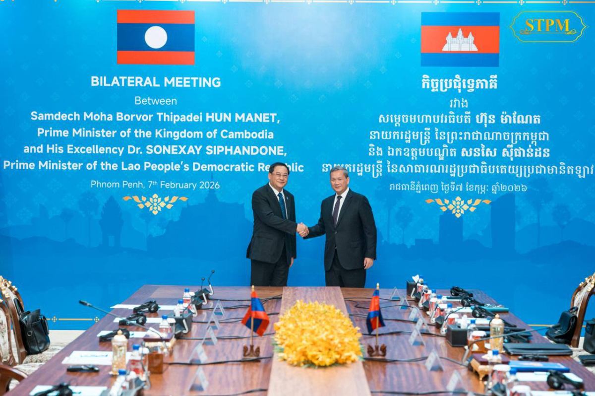 នារសៀលថ្ងៃទី០៧ ខែកុម្ភៈ ឆ្នាំ២០២៦, សម្តេចមហាបវរធិបតី ហ៊ុន ម៉ាណែត នាយករដ្ឋមន្រ្តី នៃព្រះរាជាណាចក្រកម្ពុជា បានទទួលជួបពិភាក្សាការងារជាមួយ ឯកឧត្តម សនសៃ ស៊ីផាន់ដន (Sonexay Siphandone) នាយករដ្ឋមន្រ្តីនៃសាធារណរដ្ឋប្រជាធិបតេយ្យប្រជាមានិតឡាវ នៅវិមានសាមគ្គីភាព ក្នុងឱកាសដែលឯកឧត្តមនាយករដ្ឋមន្ត្រីឡាវអញ្ជើញចូលរួមកិច្ចប្រជុំរវាងថ្នាក់ដឹកនាំកំពូលគណបក្សប្រជាជនកម្ពុជា, ថ្នាក់ដឹកនាំកំពូលគណបក្សកុម្មុយនីស្តវៀតណាម និងថ្នាក់ដឹកនាំកំពូលគណបក្សប្រជាជនបដិវត្តន៍ឡាវ នៅរាជធានីភ្នំពេញ ព្រះរាជាណាចក្រកម្ពុជា ពីថ្ងៃទី៦ដល់ថ្ងៃទី៧ ខែកុម្ភៈ ឆ្នាំ២០២៦។