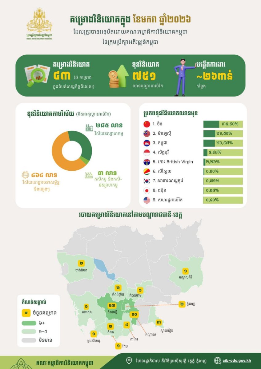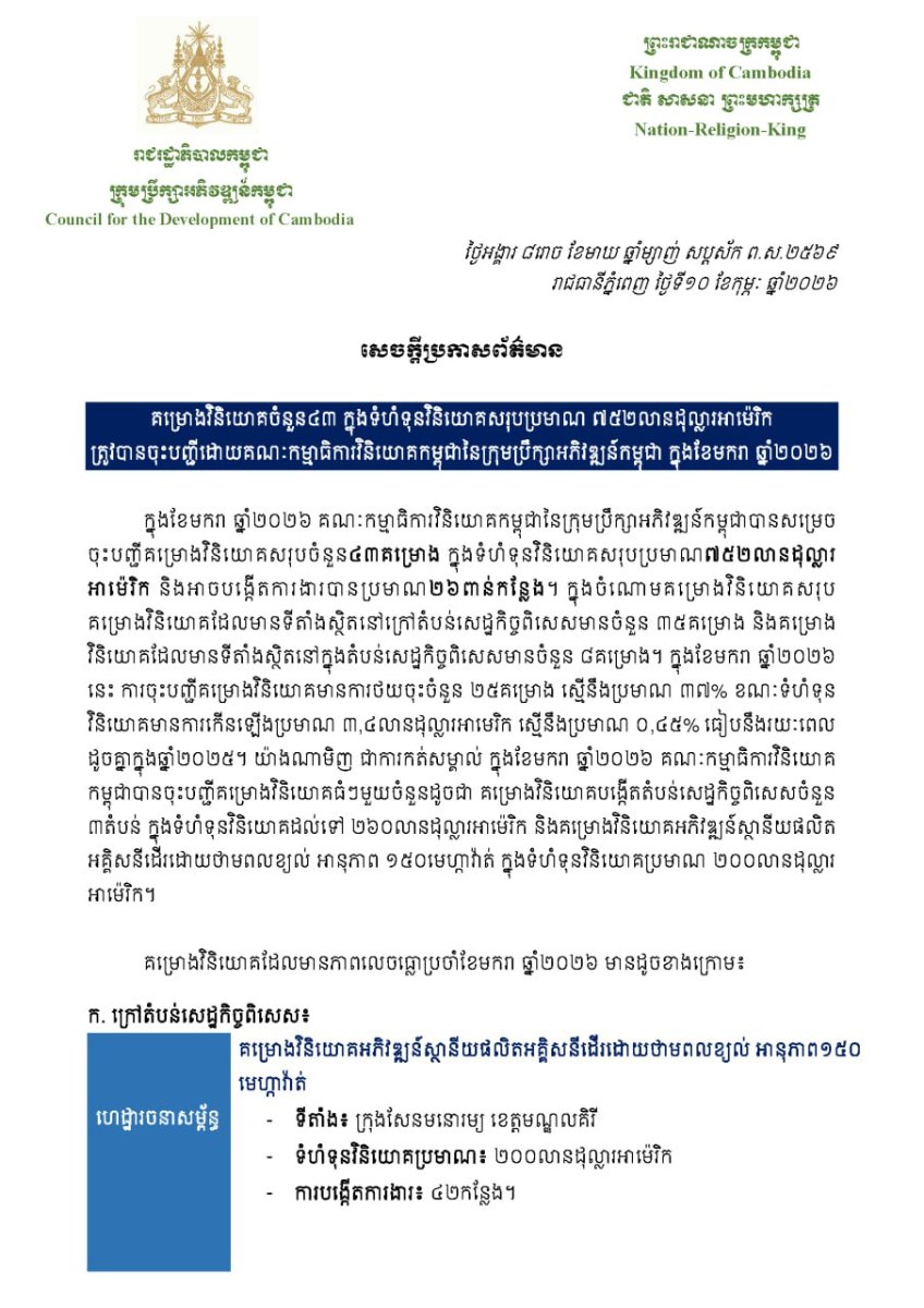 នៅក្នុងខែដំបូង ឆ្នាំ២០២៦នេះ គណៈកម្មាធិការវិនិយោគកម្ពុជា នៃក្រុមប្រឹក្សាអភិវឌ្ឍន៍កម្ពុជា បានសម្រេចចុះបញ្ជីគម្រោង វិនិយោគសរុបចំនួន ៤៣ គម្រោង ក្នុងទំហំទុនវិនិយោគសរុប ៧៥២ លានដុល្លារអាម៉េរិក និងអាចបង្កើតការងារបានប្រមាណ ២៦ ពាន់កន្លែង ក្នុងនោះនៅក្នុងចំណោមគម្រោងវិនិយោគសរុប សម្រាប់គម្រោងវិនិយោគដែលមានទីតាំងស្ថិតនៅក្រៅតំបន់សេដ្ឋកិច្ច ពិសេស មានចំនួន ៣៥ គម្រោង និងវិនិយោគដែលមានទីតាំងស្ថិតនៅក្នុងតំបន់សេដ្ឋកិច្ចពិសេស មានចំនួន ៨ គម្រោង។