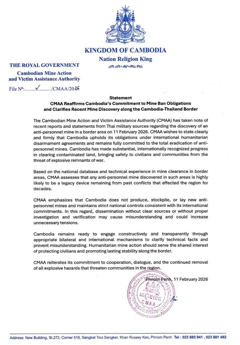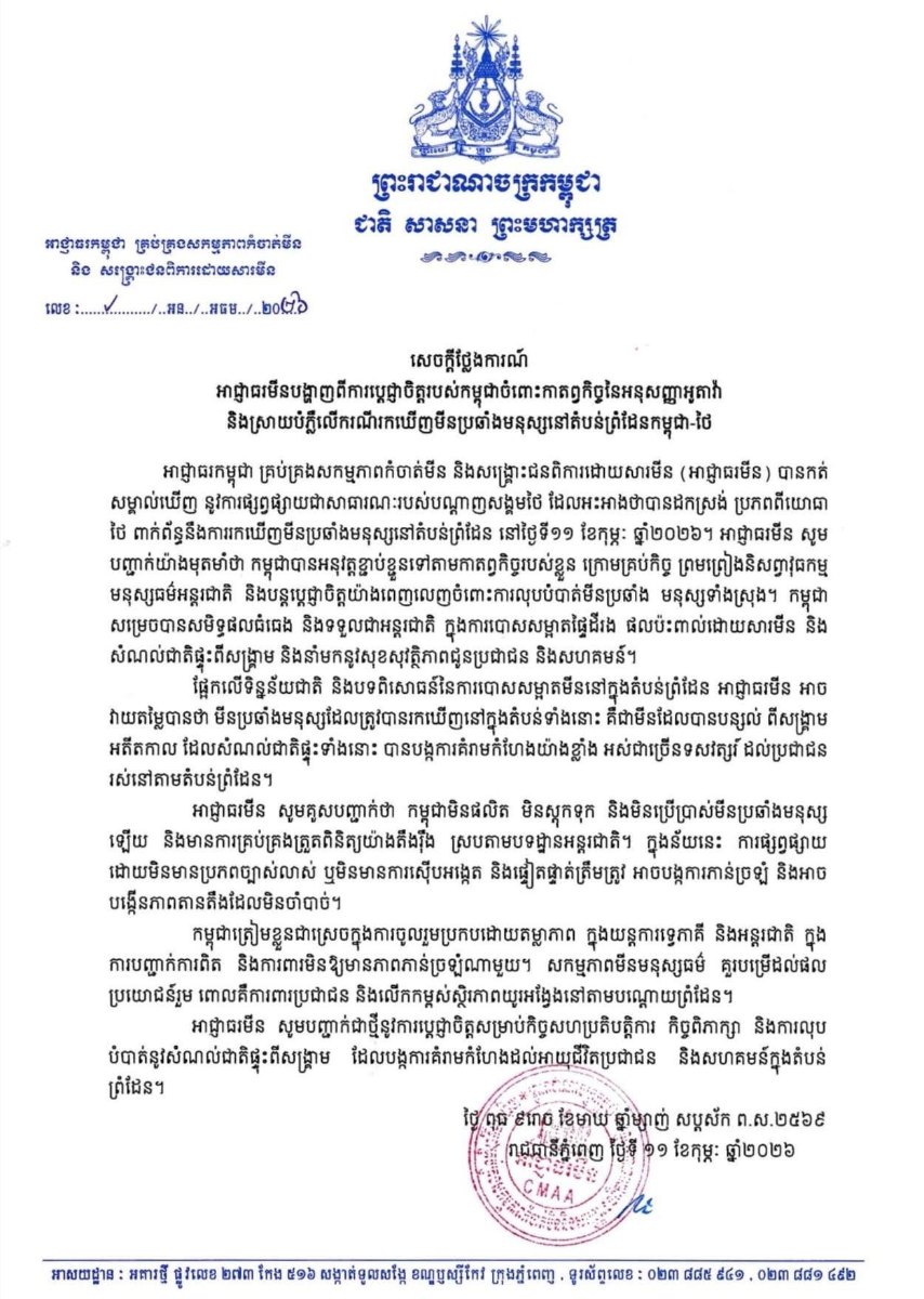តាមសេចក្ដីថ្លែងការណ៍ អាជ្ញាធរមីន កម្ពុជា បានកត់ សម្គាល់ឃើញ នូវការផ្សព្វផ្សាយជាសាធារណៈរបស់បណ្តាញសង្គមថៃ ដែលអះអាងថាបានដកស្រង់ ប្រភពពីយោធា ថៃ ពាក់ព័ន្ធនឹងការរកឃើញមីនប្រឆាំងមនុស្សនៅតំបន់ព្រំដែន នៅថ្ងៃទី១១ ខែកុម្ភៈ ឆ្នាំ២០២៦។
