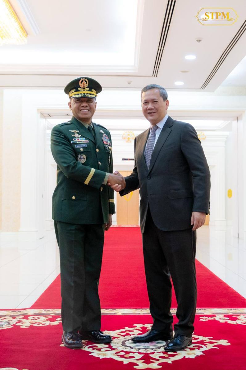 ពាក់ព័ន្ធនឹងសភាពការណ៍តាមបណ្ដោយព្រំដែនកម្ពុជា-ថៃ, សម្ដេចធិបតី ក៏បានបញ្ជាក់ជូនឯកឧត្តមអគ្គមេបញ្ជាការ និងគណៈប្រតិភូ នូវការវិវត្តថ្មីៗ នៃសភាព ការណ៍ព្រំដែន កម្ពុជា-ថៃ និងបញ្ជាក់ពីជំហររបស់កម្ពុជាក្នុងការដោះស្រាយបញ្ហាព្រំដែនដោយសន្តិវិធី ផ្អែកលើកិច្ចព្រមព្រៀងទ្វេភាគី អនុសញ្ញា និងសន្ធិសញ្ញាដែលមានស្រាប់ ព្រមទាំងច្បាប់អន្តរជាតិ។ កម្ពុជាប្ដេជ្ញាចិត្តយ៉ាងមុតមាំក្នុងការគោរពនូវកិច្ចព្រមព្រៀងដែលប្រទេសទាំងពីរបានឯកភាពគ្នានាពេលកន្លងមក។ បន្ថែមលើនេះ, សម្ដេចធិបតី បានវាយតម្លៃខ្ពស់ចំពោះតួនាទីរបស់ក្រុមអ្នកសង្កេតការណ៍អាស៊ាន (AOT) និងជឿជាក់ថា ក្រោមការដឹកនាំរបស់ហ្វីលីពីន ក្នុងនាមជាប្រធានអាស៊ានប្ដូរវេន ក្រុម AOT នឹងបន្តចូលរួមចំណែកយ៉ាងសកម្មថែមទៀតក្នុងការសម្របសម្រួលដោះស្រាយបញ្ហាព្រំដែន កម្ពុជា-ថៃ ដោយសន្តិវិធី។