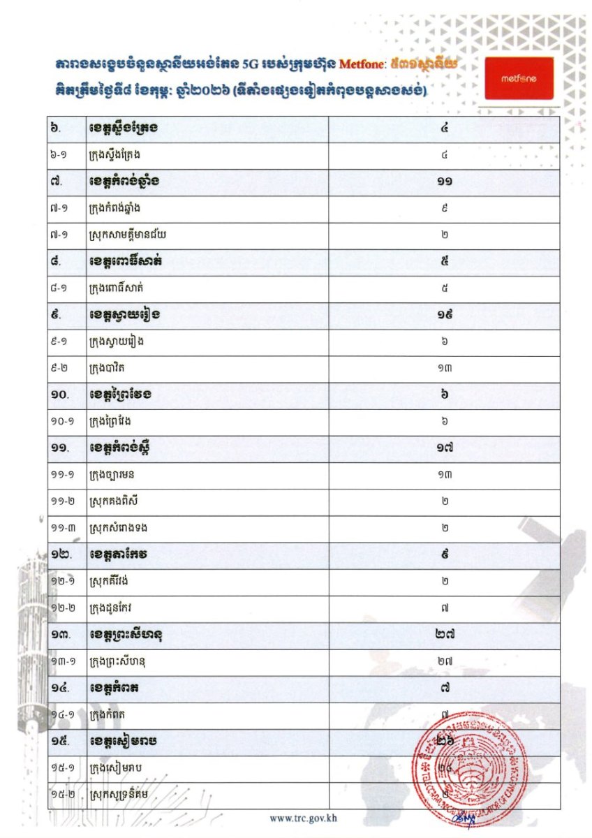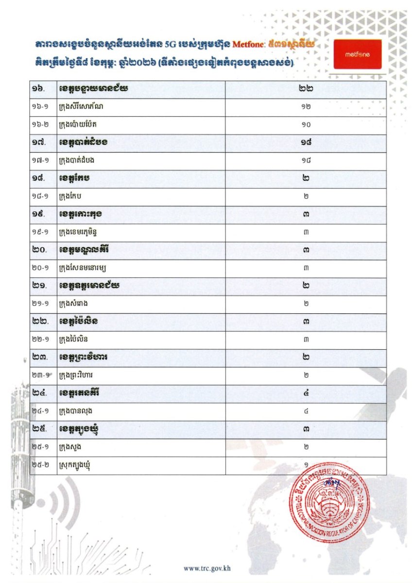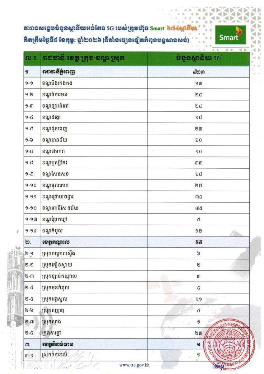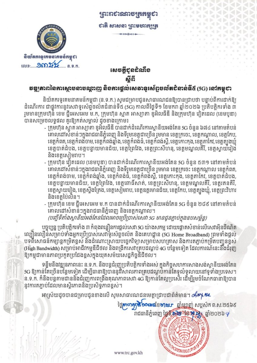 សេចក្តីជូនដំណឹង របស់និយ័តករទូរគមនាគមន៍កម្ពុជា បានផ្សាយនៅថ្ងៃទី ១២ ខែកុម្ភៈ ឆ្នាំ២០២៦ បញ្ជាក់ថា បន្ទាប់ពីការដាក់ឱ្យដំណើរការ ជាផ្លូវការនូវសេវាទូរស័ព្ទចល័តជំនាន់ទី៥ (5G) កាលពីថ្ងៃទី១ ខែមករា ឆ្នាំ២០២៦ ប្រតិបត្តិករទាំង ៣ រួមមាន ក្រុមហ៊ុន ខេម ជ្ជីអេសអេម ម.ក, ក្រុមហ៊ុន ស្មាត អាស្យាតា ខូអិលធីឌី និងក្រុមហ៊ុន វៀតធេល (ខេមបូឌា) បានដាក់ដំណើរការស្ថានីយអង់តែន 5G សរុបចំនួន ១ ៤៩៤ ទីតាំង នៅតាមបណ្តាខេត្ត-ក្រុងសំខាន់ៗ នៅទូទាំងប្រទេស។