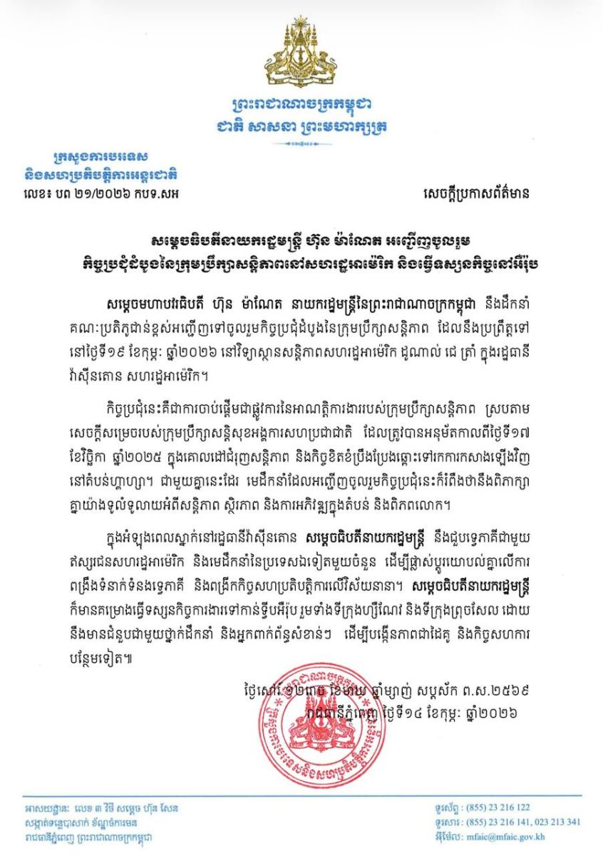 ភ្នំពេញ៖ សម្តេចមហាបវរធិបតី ហ៊ុន ម៉ាណែត នាយករដ្ឋមន្ត្រីនៃព្រះរាជាណាចក្រកម្ពុជា នឹងដឹកនាំគណៈប្រតិភូជាន់ខ្ពស់អញ្ជើញទៅចូលរួមកិច្ចប្រជុំដំបូងនៃក្រុមប្រឹក្សាសន្តិភាព ដែលនឹងប្រព្រឹត្តទៅនៅថ្ងៃទី១៩ ខែកុម្ភៈ ឆ្នាំ២០២៦ នៅវិទ្យាស្ថានសន្តិភាពសហរដ្ឋអាម៉េរិក ដូណាល់ ជេ ត្រាំ ក្នុងរដ្ឋធានី វ៉ាស៊ីនតោន សហរដ្ឋអាម៉េរិក។