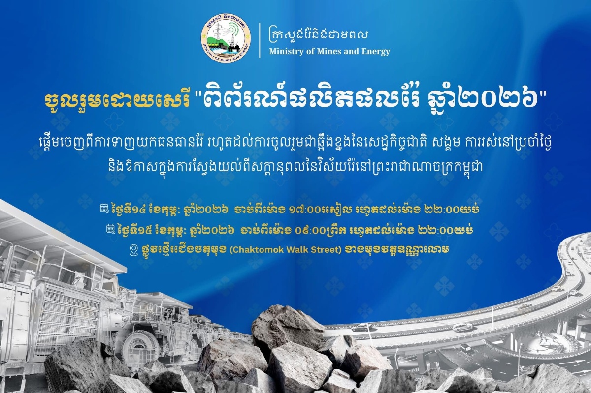 ឯកឧត្តម កែវ រតនៈ រដ្ឋមន្ត្រីក្រសួងរ៉ែ និងថាមពល នៅល្ងាចថ្ងៃទី១៤ ខែកុម្ភៈ ឆ្នាំ២០២៦ អញ្ជើញ​ជាអធិបតីបើកសម្ពោធ ពិព័រណ៍ផលិតផលរ៉ែឆ្នាំ២០២៦ ដោយមានការចូលរួម​ពីថ្នាក់ដឹកនាំ មន្ត្រីរាជការក្រសួងរ៉ែ និងថាមពល ក្រសួង ស្ថាប័ន រដ្ឋបាលរាជ ធានីភ្នំពេញ សមាគម ក្រុមហ៊ុន សាស្ត្រាចារ្យ និងនិស្សិតវិទ្យាស្ថានបច្ចេកវិទ្យាកម្ពុជា និងសមាជិកសហភាពសហព័ន្ធយុវជនកម្ពុជា បានចូលរួមក្នុងពិព័រណ៍ផលិតផលរ៉ែលើកទី១ មានរយៈពេល២ថ្ងៃ ចាប់ពីថ្ងៃទី១៤ ដល់ថ្ងៃទី១៥ ខែកុម្ភៈ ឆ្នាំ២០២៦ នៅរូបសំណាក តេជោមាស តេជោយ៉ត ទល់មុខវត្តឧណ្ណាលោម ជាប់ផ្លូវថ្មើរជើងចតុមុខ។