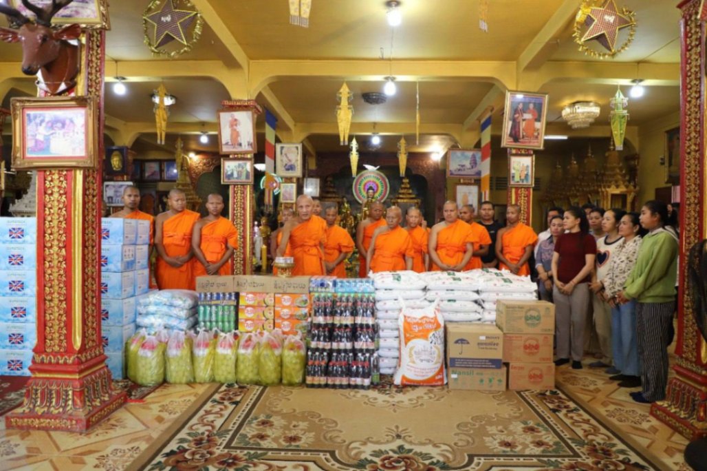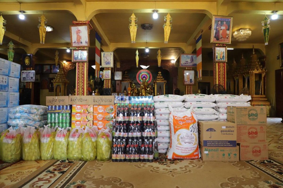 សម្រាប់អំណោយជាស្បៀងអាហារ និងសម្ភារប្រើប្រាស់ផ្សេងៗ រួមមានថវិកា ១០លានរៀលដែលជាបច្ច័យរបស់សម្តេចព្រះគ្រូចៅអធិការ, អង្ករមួយតោន, ទឹកក្រូច ១០កេស, មី ៥កេសធំ, ត្រីខ ៤កេស, សាប៊ូ ៥បាវធំ, ទឹកសុទ្ធ ៥០០កេស, អំបិល ១បាវធំ (៥០គីឡូក្រាម), ទឹកត្រី ១០យួរ, ទឹកស៊ីអ៊ីវ ១០យួរ, ទឹកម្ទេស ២កេសធំ, សៀង ១កេសធំ, នំទ្រៀបបាយ ៣កេស, ថ្នាំផ្ដាសាយ ១កេស, ថ្នាំឈឺបំពង់ក ១កេស និងពងទាប្រៃ ១ពាន់គ្រាប់ ។