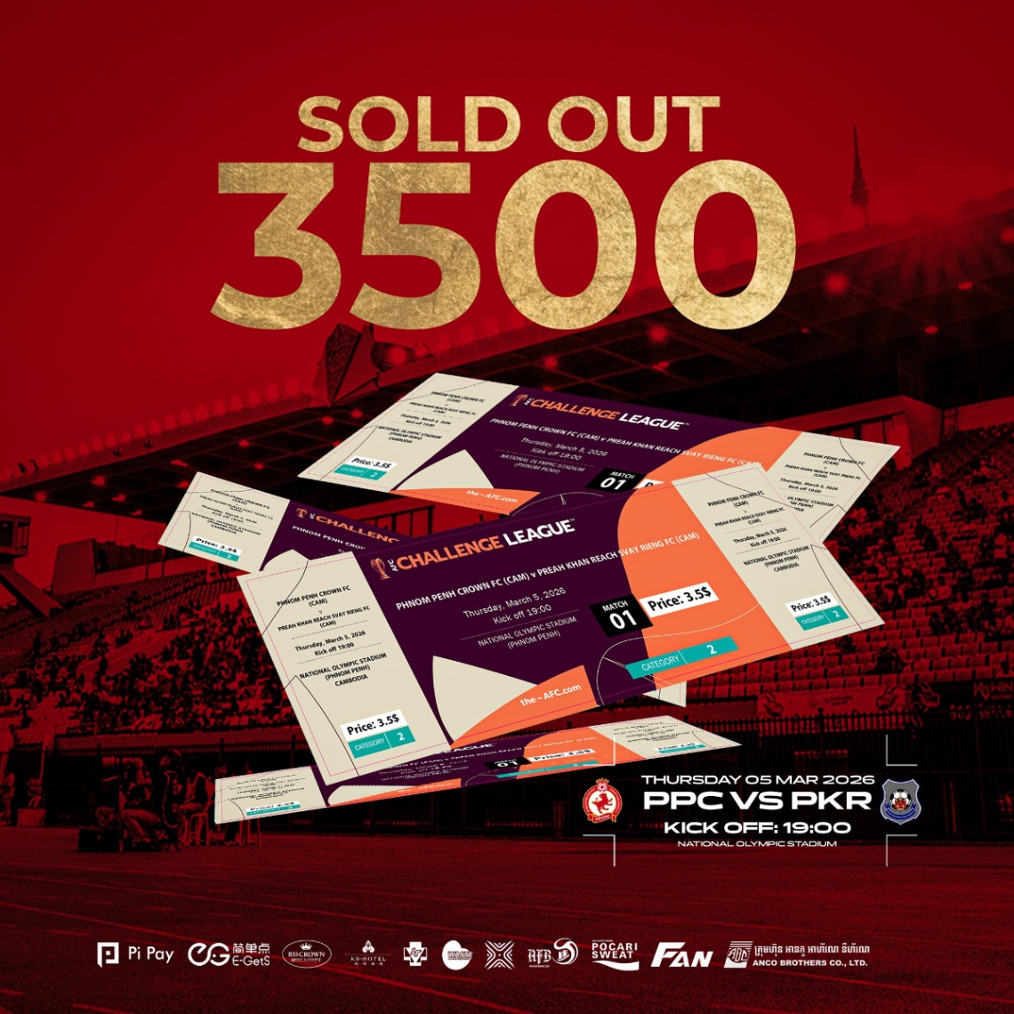 ខណៈសល់ ២សប្ដាហ៍ទៀត នឹងឈានដល់ការប្រកួតជើងទី១ រវាងភ្នំពេញក្រោន និងព្រះខ័នរាជស្វាយរៀង ក្នុងវគ្គ ៨ក្រុមចុងក្រោយ នៃពានរង្វាន់ជើងឯកក្លិបាល់ទាត់កម្រិតទី៣ ទ្វីបអាស៊ី AFC Challenge League ឆ្នាំ២០២៥/២៦ កាលពីថ្ងៃពុធកន្លងទៅ ភ្នំពេញក្រោន បានប្រកាសលក់សំបុត្រអស់ចំនួន ៣,៥០០សន្លឹកហើយ មុនការប្រកួតមកដល់ នាថ្ងៃទី៥ ខែមីនា ឆ្នាំ២០២៦ ខាងមុខ នៅពហុកីឡដ្ឋានជាតិ(អូឡាំពិក)។