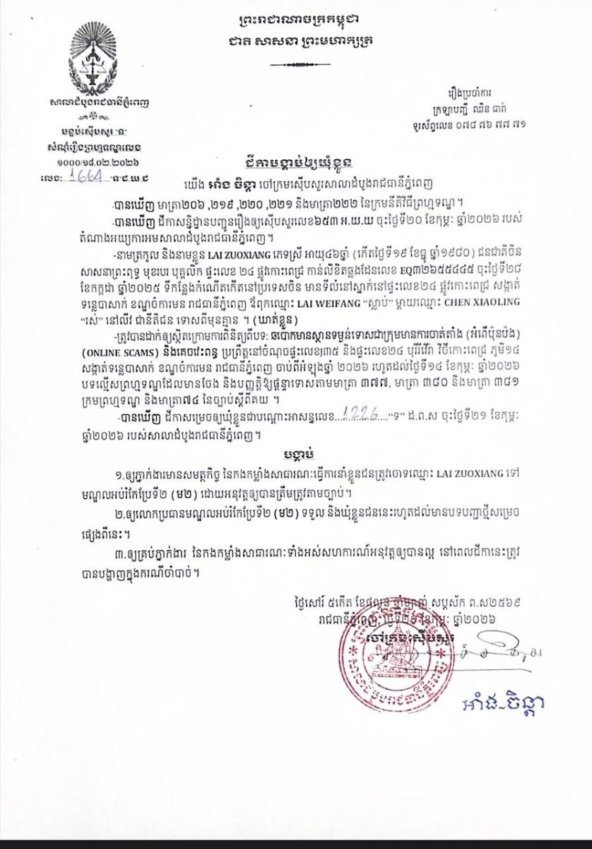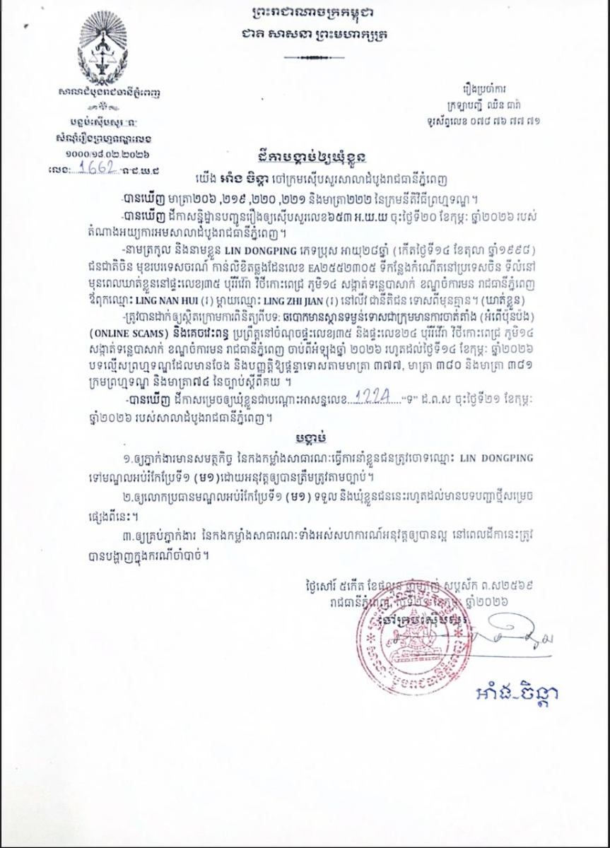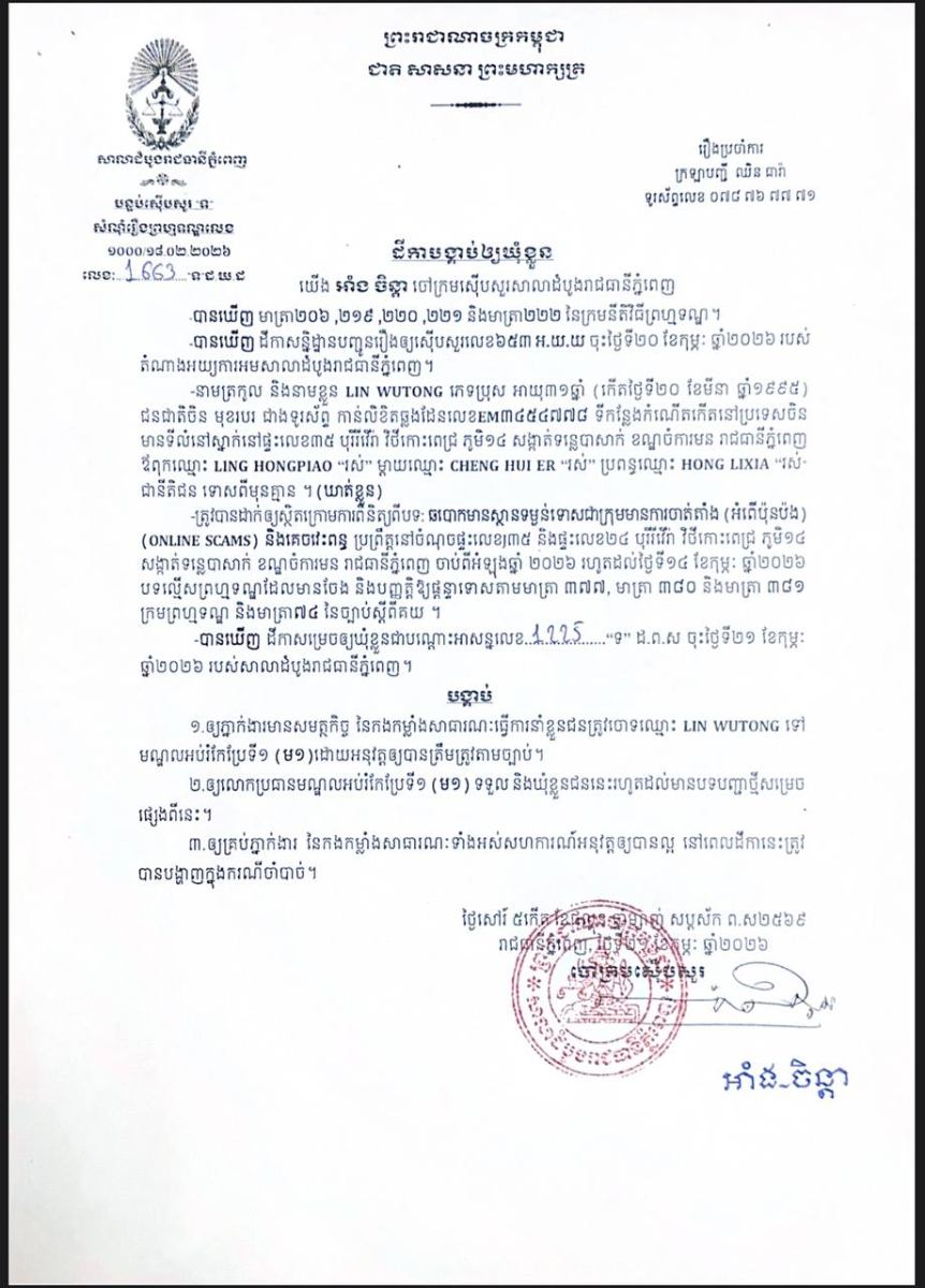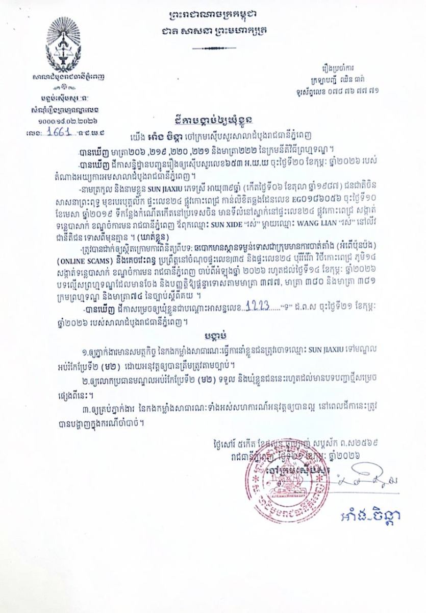 ភ្នំពេញ៖ លោក អាំង ចិន្តាចៅក្រមស៊ើបសួរនៃសាលាដំបូងរាជធានីភ្នំពេញ កាលពីថ្ងៃទី២១ ខែកុម្ភៈ ឆ្នាំ២០២៦ បានចេញដីកាចំនួន៤ផ្សេងគ្នាបង្គាប់ឱ្យឃុំខ្លួនបុរស និងស្រ្តីជនជាតិចិនចំនួន៤នាក់ ពាក់ព័ន្ធនឹងបទល្មើសឆបោកមានស្ថានទម្ងន់ទោសជាក្រុមមានការចាត់តាំង (Online Scams) និងអំពើគេចវេះពន្ធ ដែលប្រព្រឹត្តនៅក្នុងរាជធានីភ្នំពេញ។