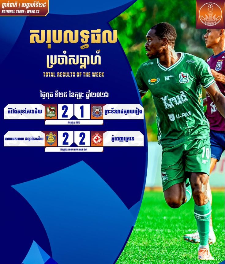 ជុំវិញលទ្ធផលដ៏ទាក់ទាញក្នុងជំនួបរវាងក្រុមលំដាប់កំពូលតារាងលីគកំពូលកម្ពុជា ទល់នឹងបេក្ខភាព ៥ក្រុមខាងក្រោម កាលពីថ្ងៃពុធនេះ សម្រាប់ការប្រកួតនៅកីឡដ្ឋានគិរីវង់ ត្រឹមរយៈពេល ៦នាទី កីឡាករ Louis Willy បានស៊ុតគ្រាប់នាំមុខឲ្យក្រុមម្ចាស់ផ្ទះ ១គ្រាប់មុន មុនកីឡាករ Tiago Alves វាយបកគ្រាប់តាមស្មើឲ្យព្រះខ័នរាជស្វាយរៀង នៅនាទី៣០។