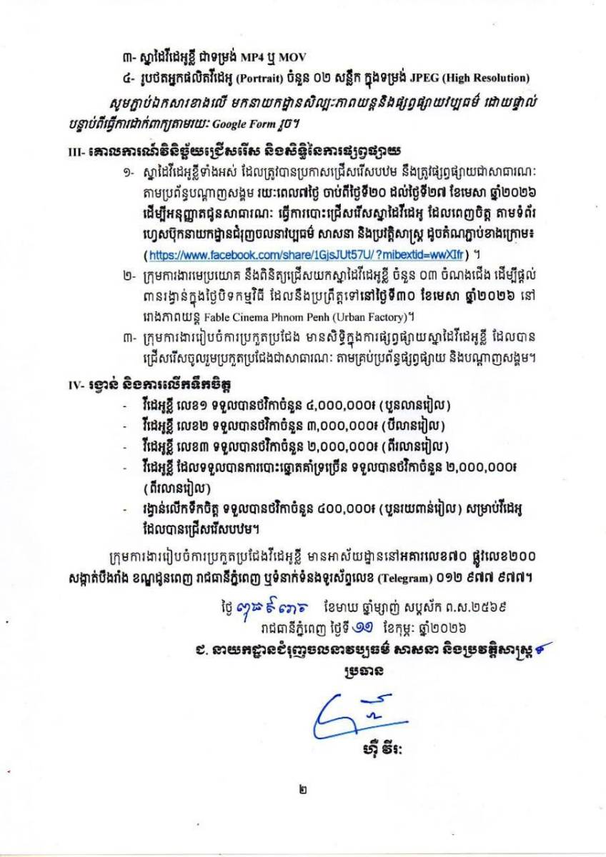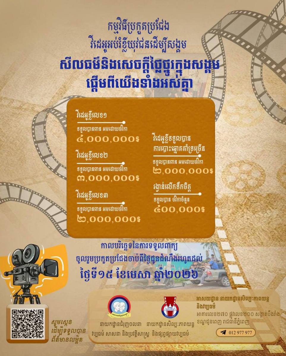 ក្រសួងវប្បធម៌បើកទទួលពាក្យការប្រកួតប្រជែងវីដេអូអប់រំខ្លីក្រោមប្រធានបទ «សីលធម៌ និងសេចក្តីថ្លៃថ្នូរក្នុងសង្គមផ្តើមពីយើងទាំងអស់គ្នា» ចាប់ផ្ដើមទទួលពាក្យពីថ្ងៃនេះដល់ពាក់កណ្ដាលខែមេសា
