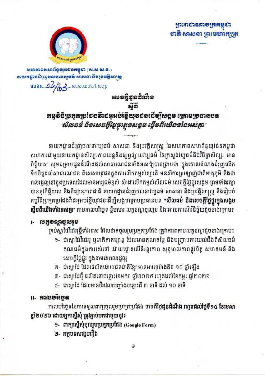លោក ប៉ុក បូរក្ស ប្រធាននាយកដ្ឋានសិល្បៈភាពយន្ត និងផ្សព្វផ្សាយវប្បធម៌ តាមរយៈBTV ព័ត៌មាន នាព្រឹកថ្ងៃទី២៦ ខែកុម្ភះ ឆ្នាំ២០២៦នេះថា ដើម្បីចូលរួមលើកកម្ពស់ការយល់ដឹងអំពីសីលធម៌ និងការគោរពសេចក្តីថ្លៃថ្នូររបស់មនុស្ស ព្រមទាំងលើកទឹកចិត្តឱ្យយុវជនបង្ហាញនូវគំនិតច្នៃប្រឌិត និងទំនួលខុសត្រូវក្នុងការរស់នៅជាមួយគ្នាក្នុងសង្គម សូមជូនដំណឹងដល់សិស្ស និស្សិត យុវជនទាំងឡាយ និងសាធារណជនទាំងអស់ នាយកដ្ឋានជំរុញចលនាវប្បធម៌ សាសនា និងប្រវត្តិសាស្ដ្រ នៃសហភាពសហព័ន្ធយុវជនកម្ពុជា សហការជាមួយនាយកដ្ឋានសិល្បៈភាពយន្ត និងផ្សព្វផ្សាយវប្បធម៌ នឹងរៀបចំកម្មវិធីប្រកួតប្រជែងវីដេអូអប់រំខ្លី។ ប្រធានបទខាងលើនេះលើកទឹកចិត្តឱ្យមនុស្សគ្រប់រូប សង្កេតពិចារណា យល់ដឹងពីតួនាទីរបស់ខ្លួនក្នុងសង្គម និងរួមចំណែកបង្កើតបរិយាកាសដែលពោរពេញដោយការស្រលាញ់ ការគោរព ក្តីមេត្តា និងសាមគ្គីភាពក្នុងសង្គម។ កាលបរិច្ឆេទនៃការទទួលពាក្យ ចាប់ពីថ្ងៃជូនដំណឹងរហូតដល់ថ្ងៃទី១៥ ខែមេសា ឆ្នាំ២០២៦។