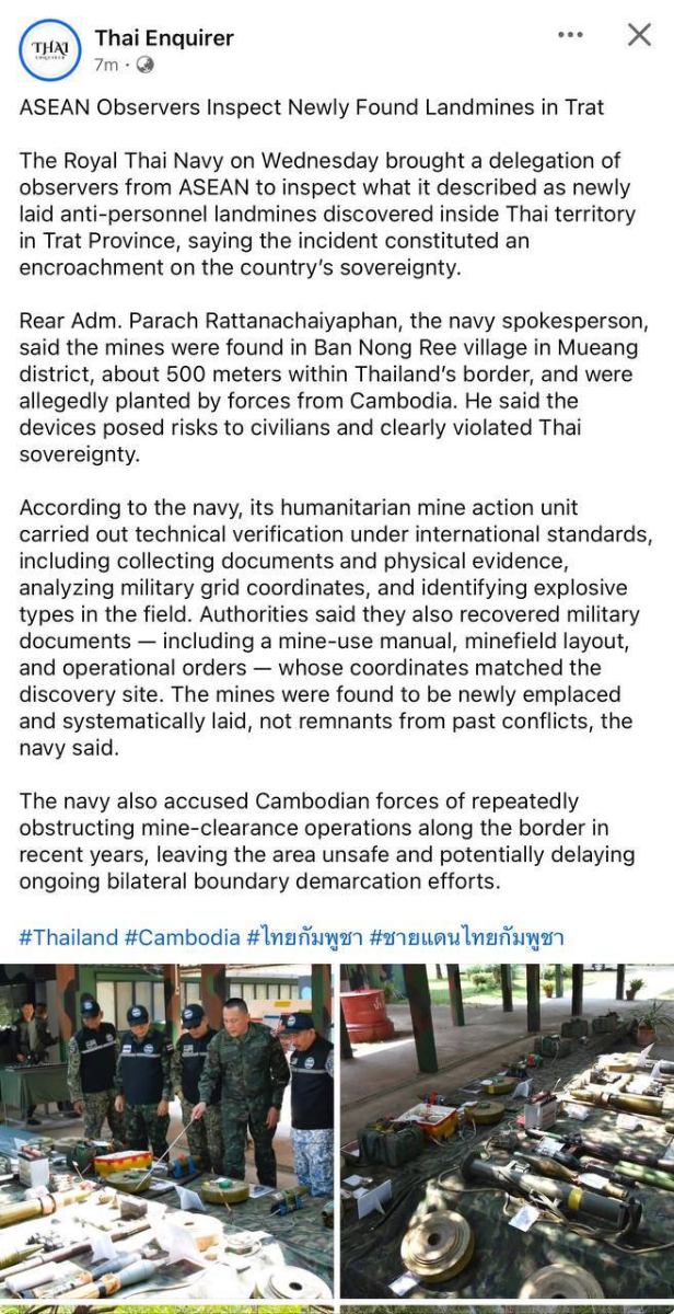 ក្នុងន័យនេះ ការរក្សាទុកភស្តុតាង ការស៊ើបអង្កេត ការធ្វើសេចក្តីសន្និដ្ឋានជាឯកតោភាគី និងការ បង្ហាញសេចក្តីសន្និដ្ឋានជាសាធារណៈដោយអាជ្ញាធរថៃ គឺជាសកម្មភាពឯកតោភាគីទាំងស្រុង ដែលទង្វើ នេះ មិនត្រូវបានចាត់ទុកថាជាការស្វែងរកការពិត ប្រកបដោយភាពស្មោះត្រង់នោះឡើយ។ បញ្ហាមីន គឺជាបញ្ហារសើប និងតម្រូវឱ្យមានការផ្ទៀងផ្ទាត់បច្ចេកទេសរួមគ្នា ដែលត្រូវធ្វើឡើងប្រកបដោយតម្លាភាព វិជ្ជាជីវៈ និងកិច្ចសហប្រតិបត្តិការ។