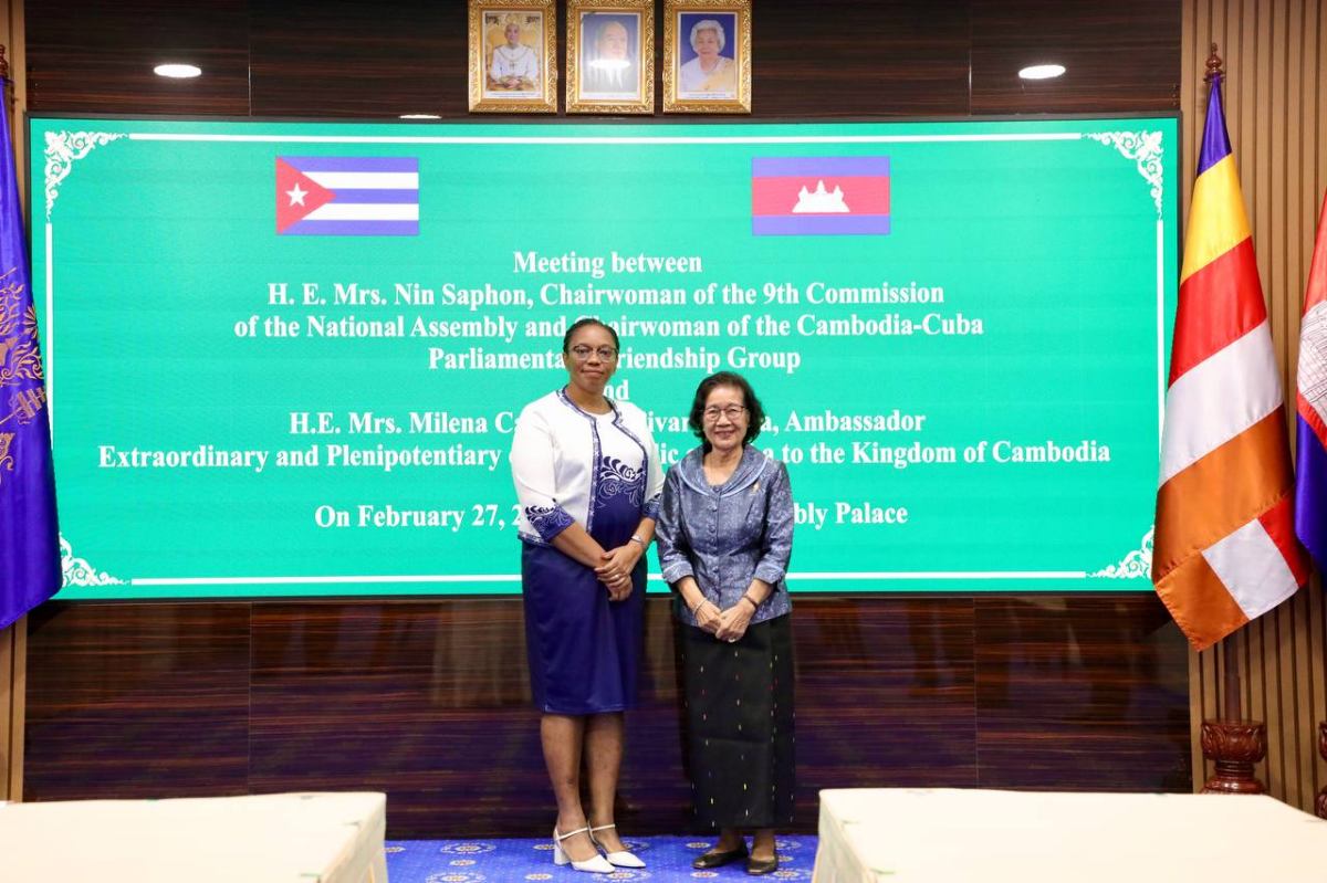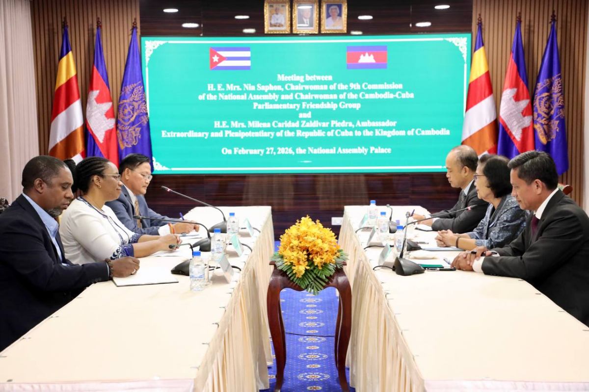 ភ្នំពេញ៖ លោកជំទាវ និន សាផុន ប្រធានគណៈកម្មការទី៩ នៃរដ្ឋសភា និងជាប្រធានក្រុមមិត្តភាពរដ្ឋសភាកម្ពុជា-គុយបា នាព្រឹកថ្ងៃទី២៧ ខែកុម្ភៈ ឆ្នាំ២០២៦ បានទទួលជួបពិភាក្សាការងារជាមួយ លោកជំទាវ មីឡេនណា ការីដាដ ហ្សាឌីវ៉ា ពាដ្រា (Milena Caridad Zaldívar Piedra) ឯកអគ្គរដ្ឋទូតវិសាមញ្ញនិងពេញសមត្ថភាព នៃសាធារណរដ្ឋគុយបា ប្រចាំនៅព្រះរាជាណាចក្រកម្ពុជា ដើម្បីបង្ហាញពី បច្ចុប្បន្នភាពថ្មីៗនៃស្ថានការណ៍នៅក្នុងប្រទេសទាំងពីរ កម្ពុជា-គុយបា និងការពង្រឹងពង្រីកចំណងមិត្តភាព កិច្ចសហប្រតិបត្តិការជាប្រវត្តិសាស្ត្រ នៃប្រទេសទាំងពីរ ឱ្យកាន់តែរឹងមាំ និងសកម្មឡើង ដើម្បីបម្រើដល់ផលប្រយោជន៍នៃប្រទេសទាំងពីរ។