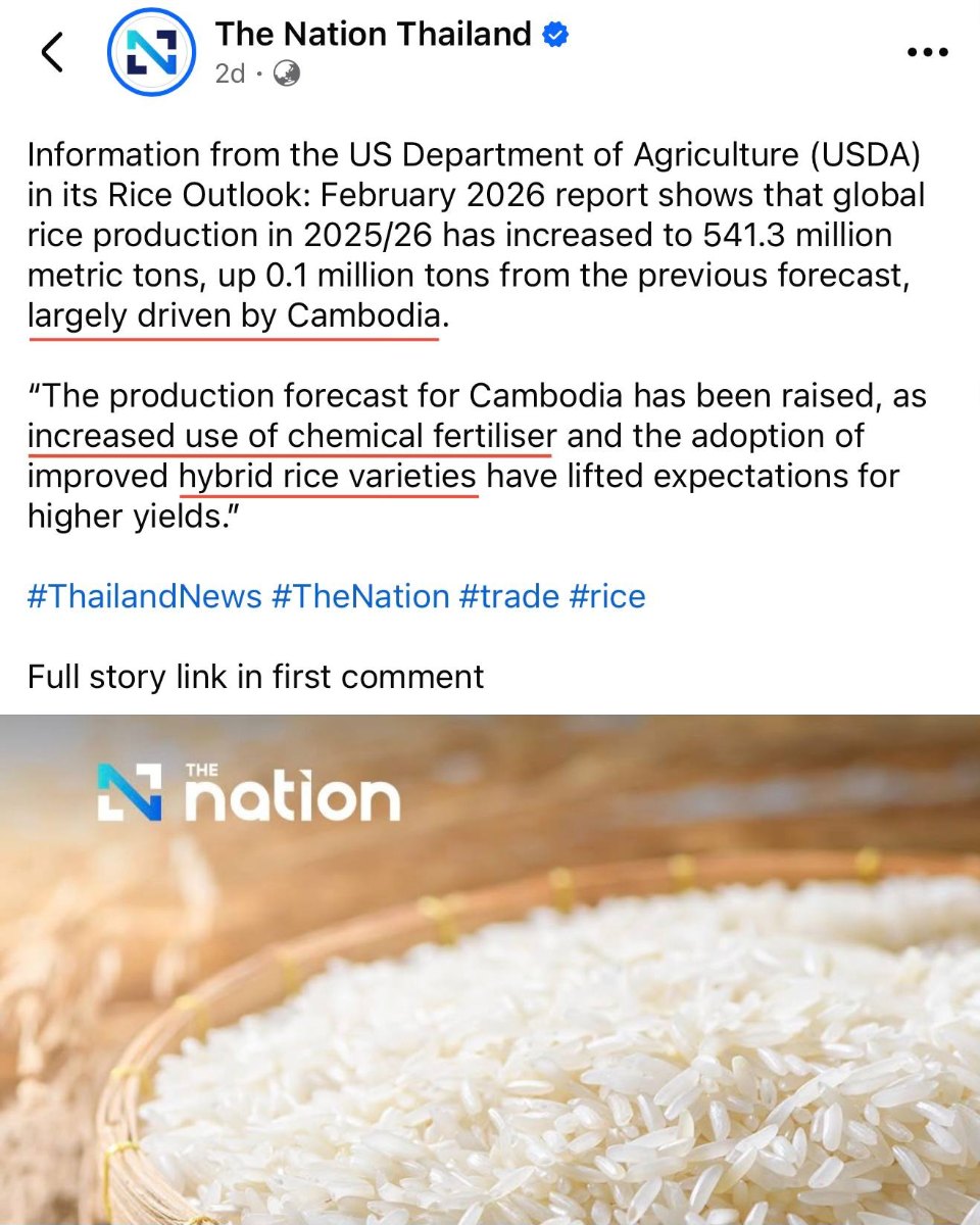 អ្នកនាំពាក្យក្រសួងកសិកម្ម ឯកឧត្តម ឃឹម ហ្វីណង់ បានថ្លែងថា ថ្មីៗនេះសារព័ត៌មាន The Nation Thailand បានចុះផ្សាយអំពីរបាយការណ៍ Rice Outlook – February 2026 របស់ក្រសួងកសិកម្មអាមេរិក (USDA) ដែលបានបង្ហាញពីការកើនឡើងនៃបរិមាណផលស្រូវរបស់កម្ពុជា ហើយបានសន្និដ្ឋានថា កំណើននេះគឺដោយសារការបង្កើនការប្រើប្រាស់ជី និងការប្រើប្រាស់ពូជស្រូវ Hybrid។
