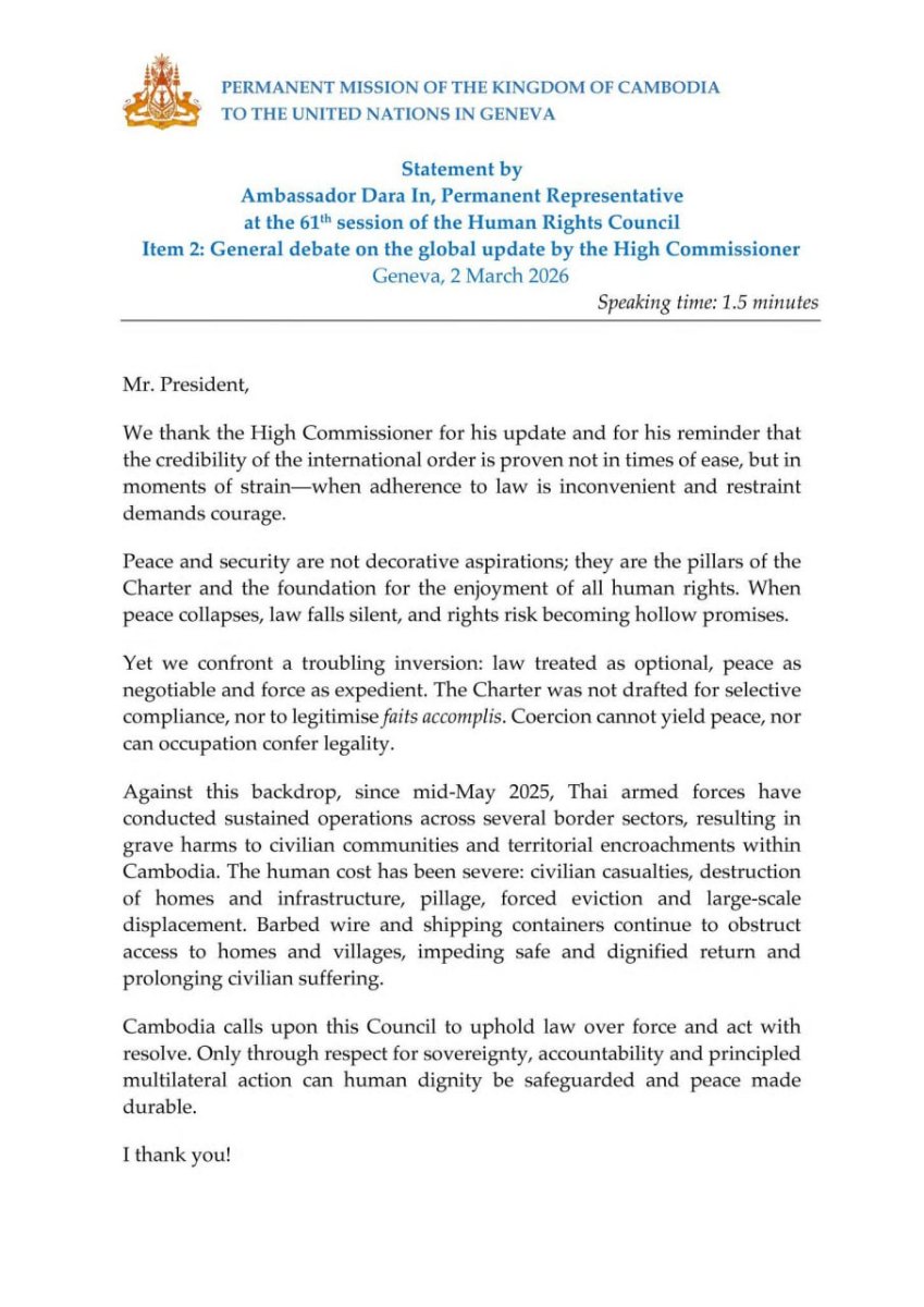 ការអំពាវនាវបែបនេះរបស់កម្ពុជា ធ្វើឡើងនៅក្នុង សម័យប្រជុំលើកទី៦១ នៃក្រុមប្រឹក្សាសិទ្ធិមនុស្ស តាមរយៈបទទន្តរាគមន៍របស់ ឯកឧត្តម ឯកអគ្គរាជទូត អ៊ិន តារា តំណាងអចិន្ត្រៃយ៍កម្ពុជា ប្រចាំអង្គការសហប្រជាជាតិ នៅទីក្រុងហ្សឺណែវ បានថ្លែងក្នុងអំឡុងកិច្ចពិភាក្សាលើរបាយការណ៍របស់ឧត្តមស្នងការទទួលបន្ទុកសិទ្ធិមនុស្សនេះនៅរសៀល ថ្ងៃទី២ ខែមីនា ឆ្នាំ២០២៦។