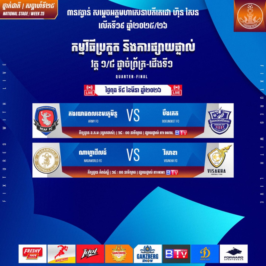 ពានរង្វាន់សម្ដេចអគ្គមហាសេនាបតីតេជោ ហ៊ុន សែន លើកទី១៩ ឆ្នាំ២០២៥/២៦ (ថ្នាក់ជាតិ) នឹង​បន្ដការប្រកួតជើងទី១ ក្នុងវគ្គ ៨ក្រុមចុងក្រោយចំនួន ២ប្រកួតទៀត នាថ្ងៃពុធ ទី៤ ខែមីនា ឆ្នាំ​២០២៦នេះ ដោយក្រុមណាហ្គាវើលដ៏ ត្រូវជួបក្រុមភ្ញៀវវិសាខា នៅកីឡដ្ឋានខេត្តកំពង់ស្ពឺ និង​ក្រុម​បឹងកេត ត្រូវជួបក្រុមម្ចាស់ផ្ទះកងយោធពលខេមរភូមិន្ទ នៅកីឡដ្ឋានស្ដាតចាស់។