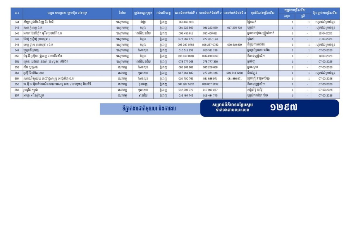 ក្រសួងការងារបានបញ្ជាក់ថា ក្រៅពីទំនាក់ទំនងផ្ទាល់ជាមួយក្រុមហ៊ុន រោងចក្រ សហគ្រាស អ្នកស្វែងរកការងារទាំងអស់ ជាពិសេសបងប្អូនអតីតពលករ ក៏អាចទាក់ទងមកប្រព័ន្ធទំនាក់ទំនងបន្ទាន់ ១២៩៧ ដើម្បីឱ្យក្រសួងការងារជួយសម្របសម្រួលស្វែងរកការងារជូនផងដែរ៕